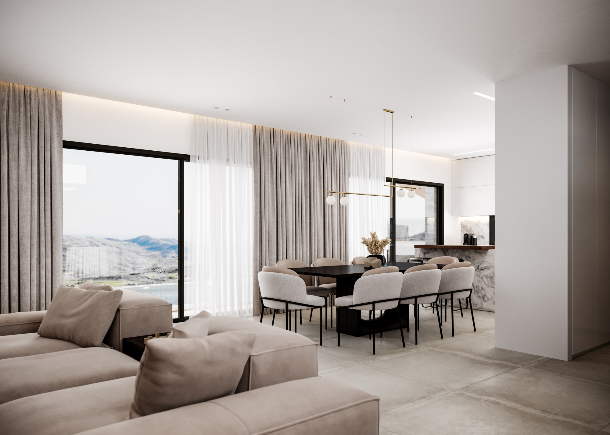 Все резиденции строятся с вниманием к деталям и с использованием высококачественных материалов как в интерьере, так и в экстерьере построек. Энергоэффективность класса А является показателем качества применяемых строительных материалов. Это проект для тех кто любит сочетать чистейший горный воздух с прекрасным видом на море, кто любит долгие прогулки по зеленой холмистой местности, ценит тишину и приватность , но и не хочет сильно отдаляться от всех благ и удобств современной цивилизации, так как сам Пафос расположен всего в 10 минутах езды.