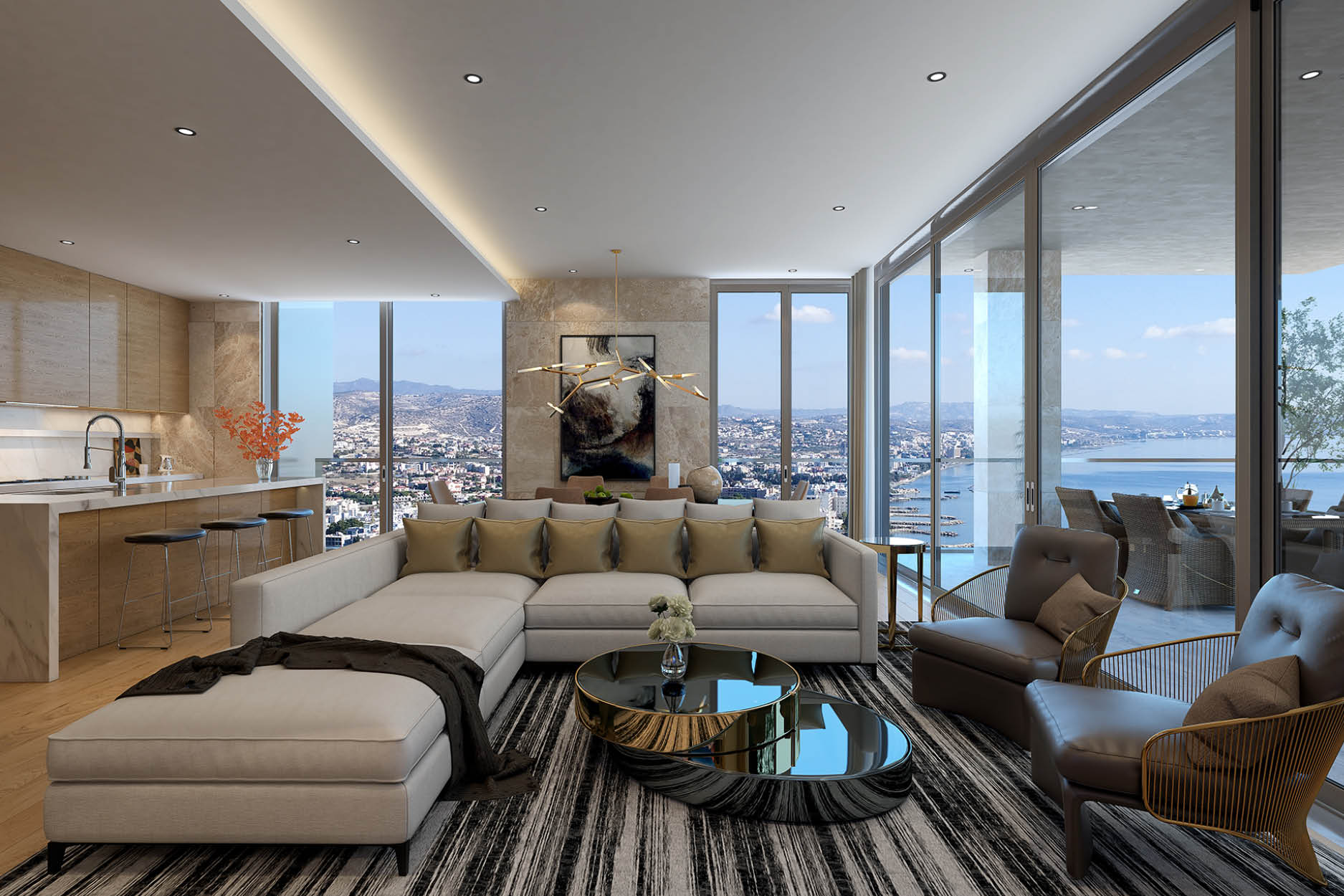 Высотное здание расположено в самом сердце Лимассола, в окружении высококлассных отелей, кафе, бутиков, а яхтенная марина мирового уровня находится на расстоянии вытянутой руки.