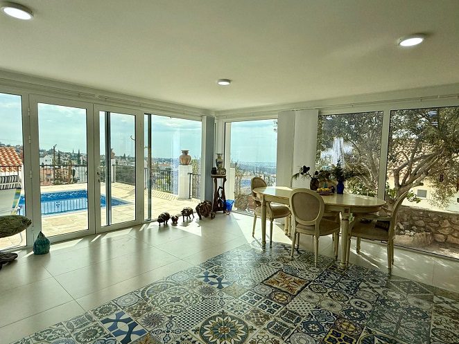 Это бунгало построено на достаточно большом участке площадью 1000 м², а его планировка сочетает в себе эстетику и функциональность. В доме есть просторная, полностью оборудованная кухня с отдельным хранилищем и подсобным помещением/прачечной, большая гостиная открытой планировки с уютным камином, которая выходит на большую веранду ведущую в сад, и плавно соединенную с бассейном и еще одной крытой верандой, ведущей в сад сбоку от дома. Есть 3 спальни и 3 ванные комнаты, рабочее пространство и прихожая, а также крытая парковка и гараж. Дом продается частично меблированным, оборудованным бытовой техникой, кондиционером, центральным отоплением и подогреваемыми полами в гостиной и ванных комнатах. Недвижимость может похвастаться 11 кВт фотоэлектрическими элементами для повышения энергоэффективности и скважиной с водой, что значительно снижает расходы на содержание бассейна. На участке есть дополнительный маленький домик со спальней и ванной комнатой, который можно использовать как мастерскую или для прислуги. Общая крытая площадь бунгало и дополнительного дома — 340 кв. м. Титулы собственности в наличии.