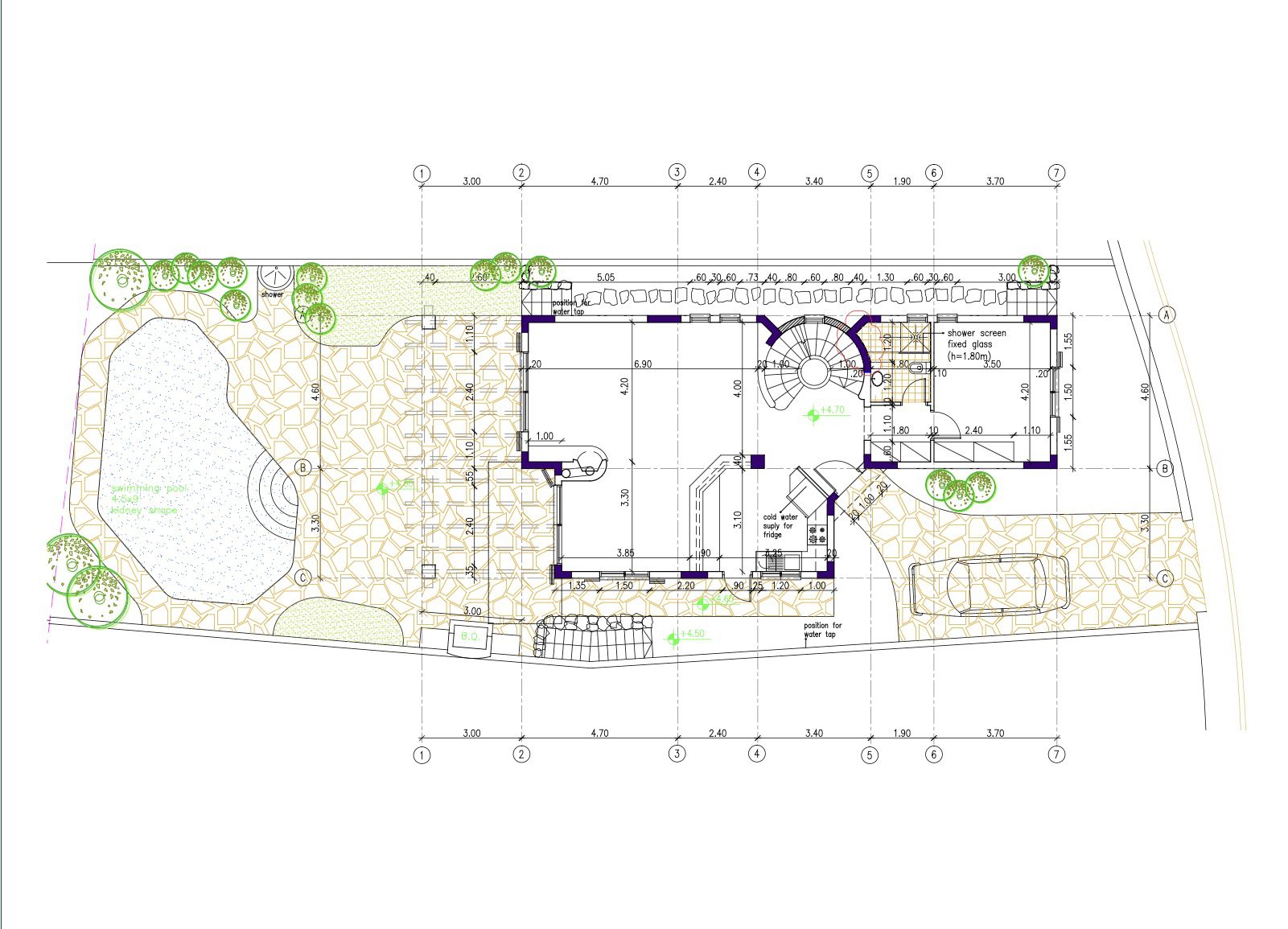 - Частный бассейн в форме почки (4,5 × 8 м) с каменной террасой вокруг