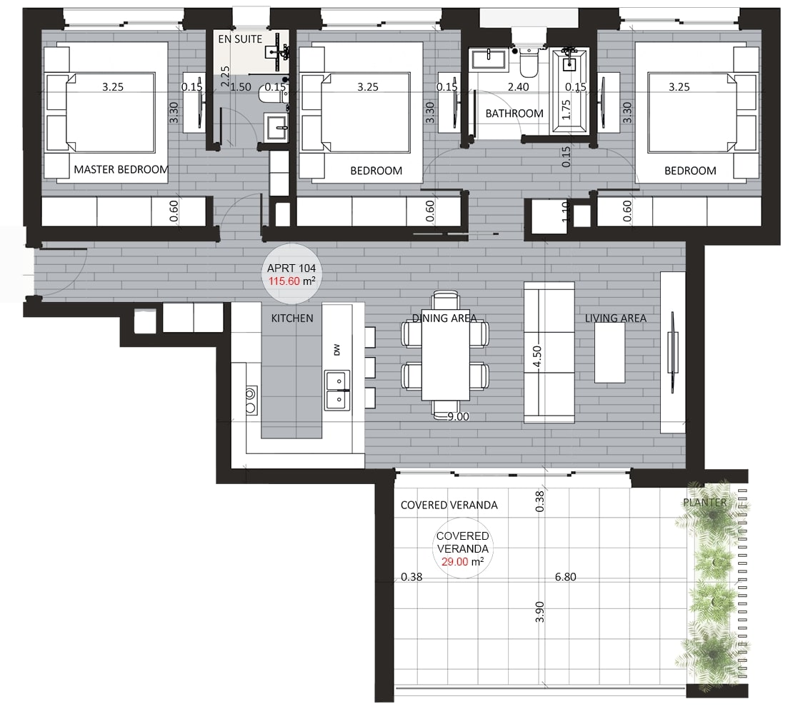 - Роскошные апартаменты с 3 спальнями: Каждая резиденция имеет просторные террасы, идеально подходящие для встреч или спокойных вечеров.
