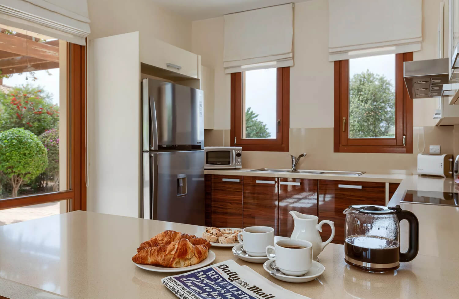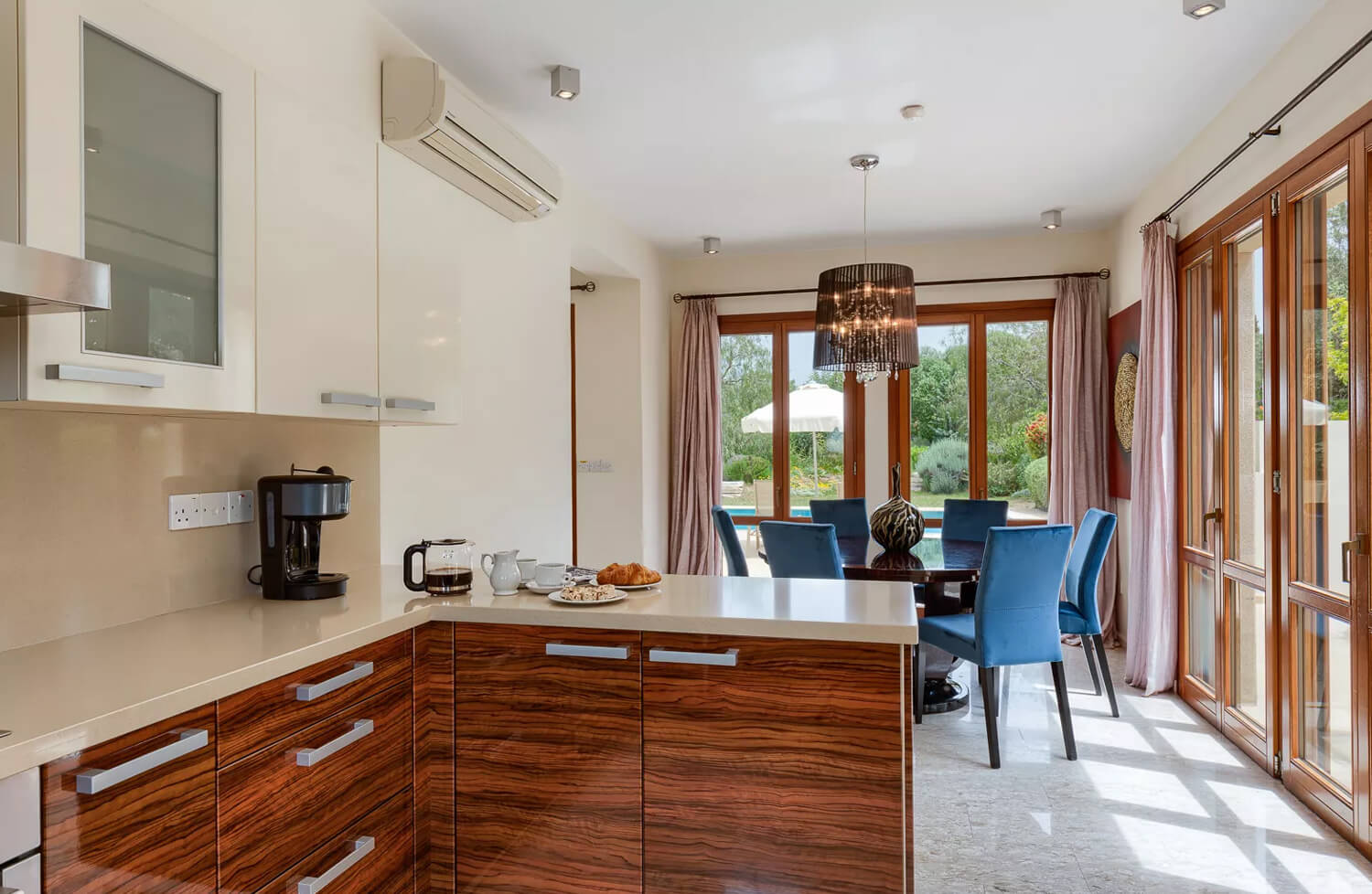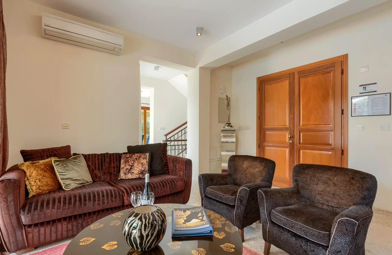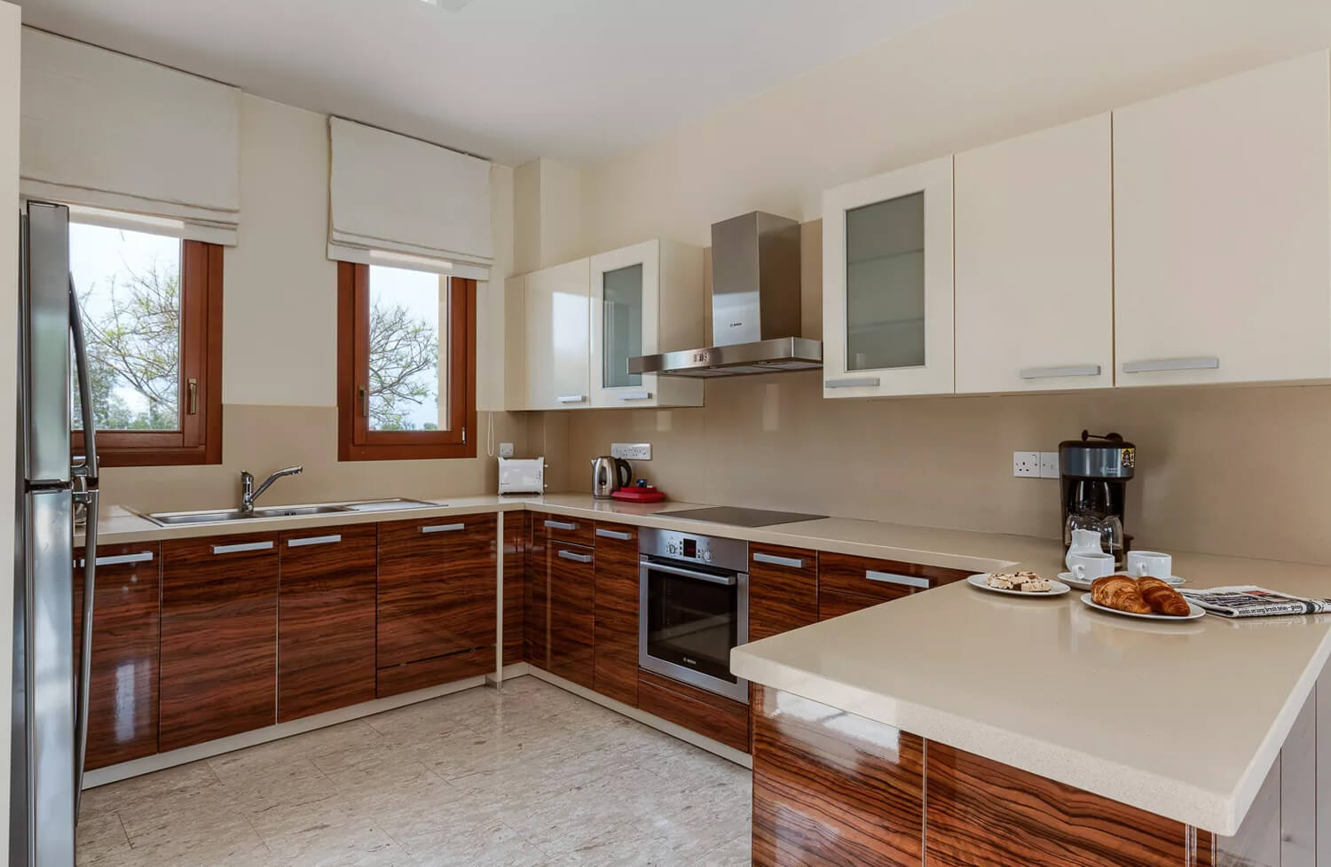 Эта вилла с двумя спальнями расположена в тихом переулке на восточном плато курорта Афродита Хиллс. В жилой зоне виллы, расположенной на первом этаже, есть двухместный диван и два кресла. С противоположной стороны от мраморной лестницы находится обеденная зона с большим круглым деревянным столом на шесть человек. Кухня, выполненная в итальянском стиле с гранитными столешницами и полностью оборудованная техникой из нержавеющей стали, от посудомоечной машины до двухдверного американского холодильника с морозильной камерой, расположена рядом с обеденной зоной. На первом этаже также есть гостевая гардеробная.