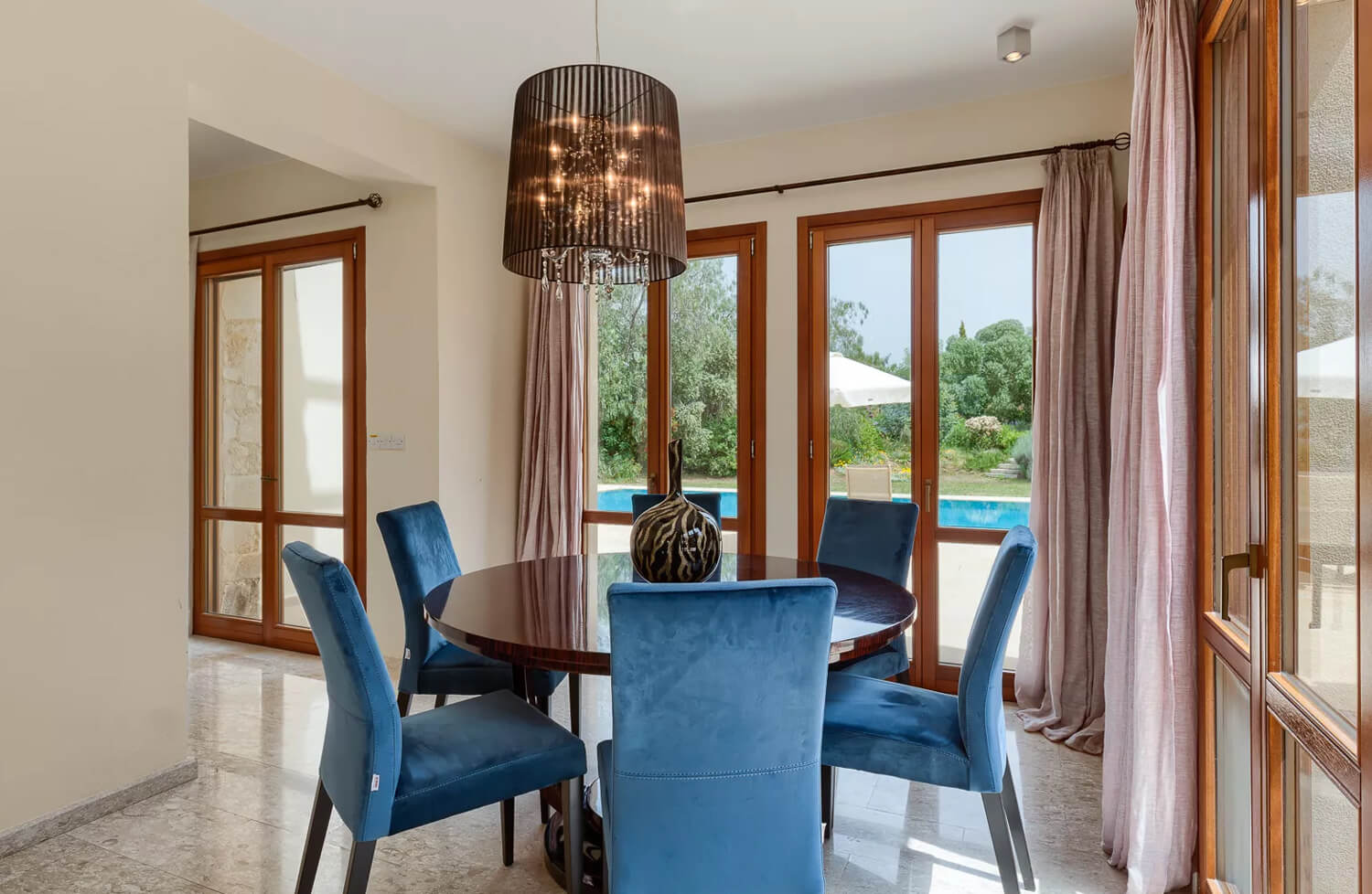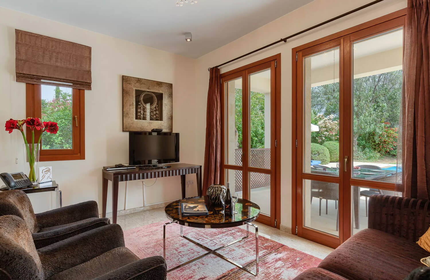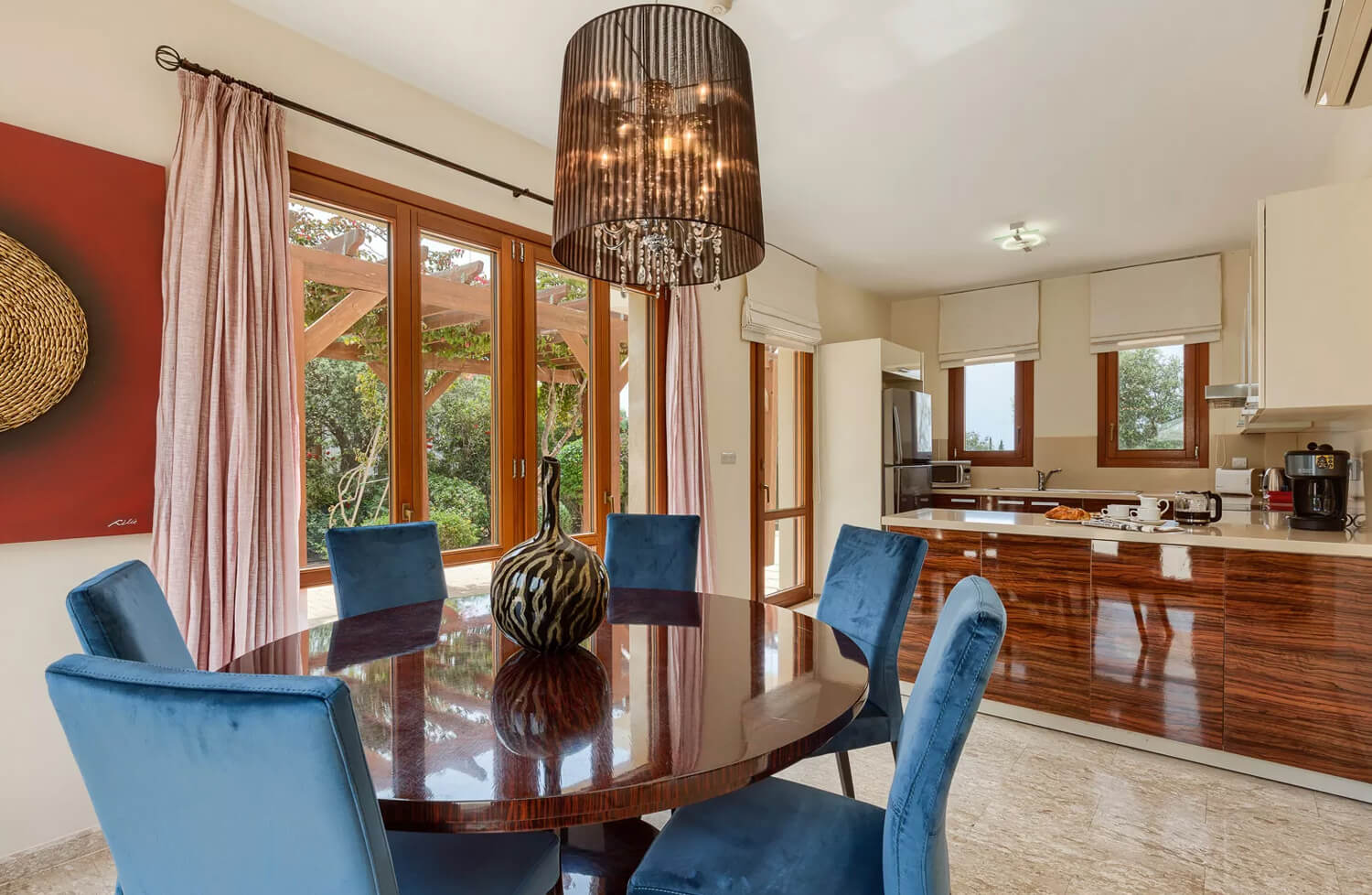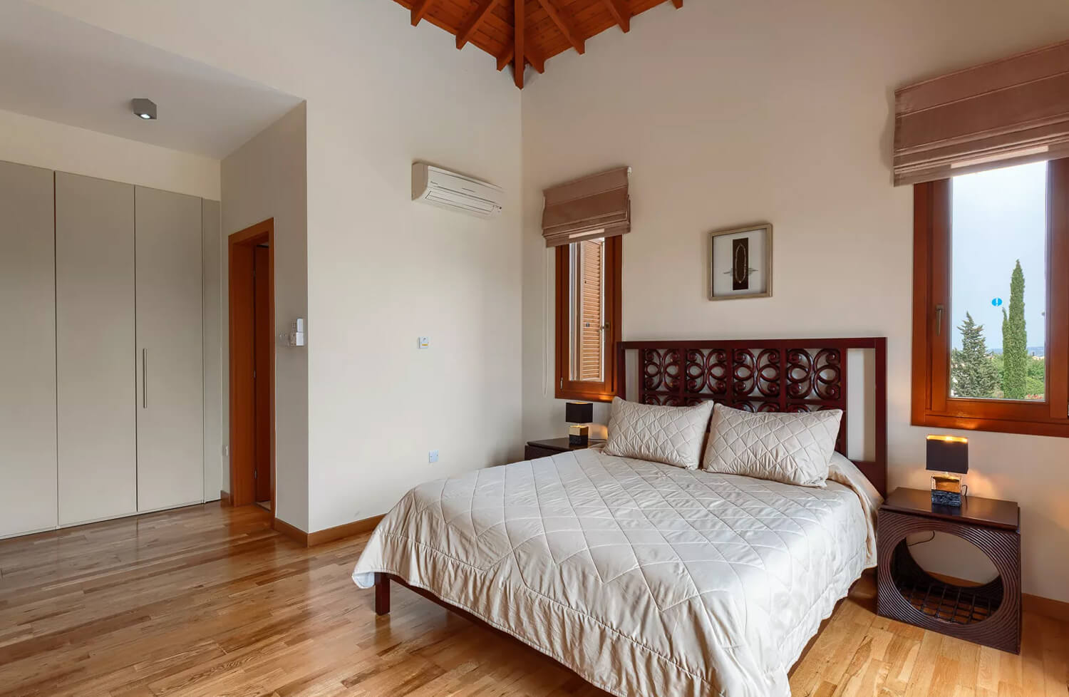 Эта вилла с двумя спальнями расположена в тихом переулке на восточном плато курорта Афродита Хиллс. В жилой зоне виллы, расположенной на первом этаже, есть двухместный диван и два кресла. С противоположной стороны от мраморной лестницы находится обеденная зона с большим круглым деревянным столом на шесть человек. Кухня, выполненная в итальянском стиле с гранитными столешницами и полностью оборудованная техникой из нержавеющей стали, от посудомоечной машины до двухдверного американского холодильника с морозильной камерой, расположена рядом с обеденной зоной. На первом этаже также есть гостевая гардеробная.