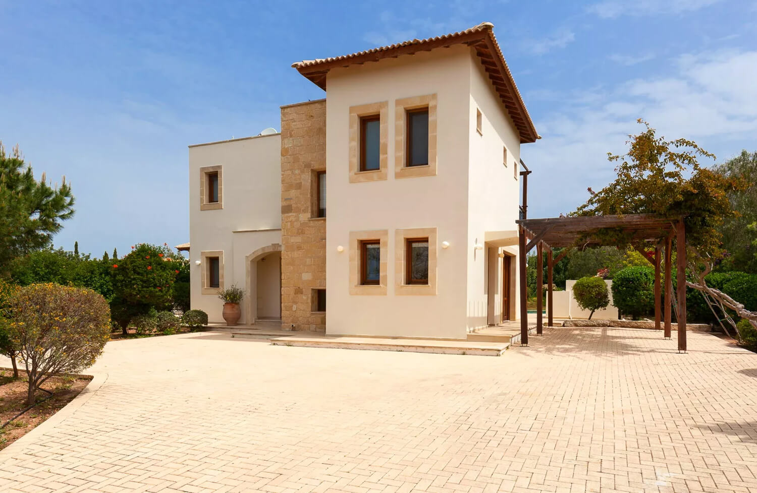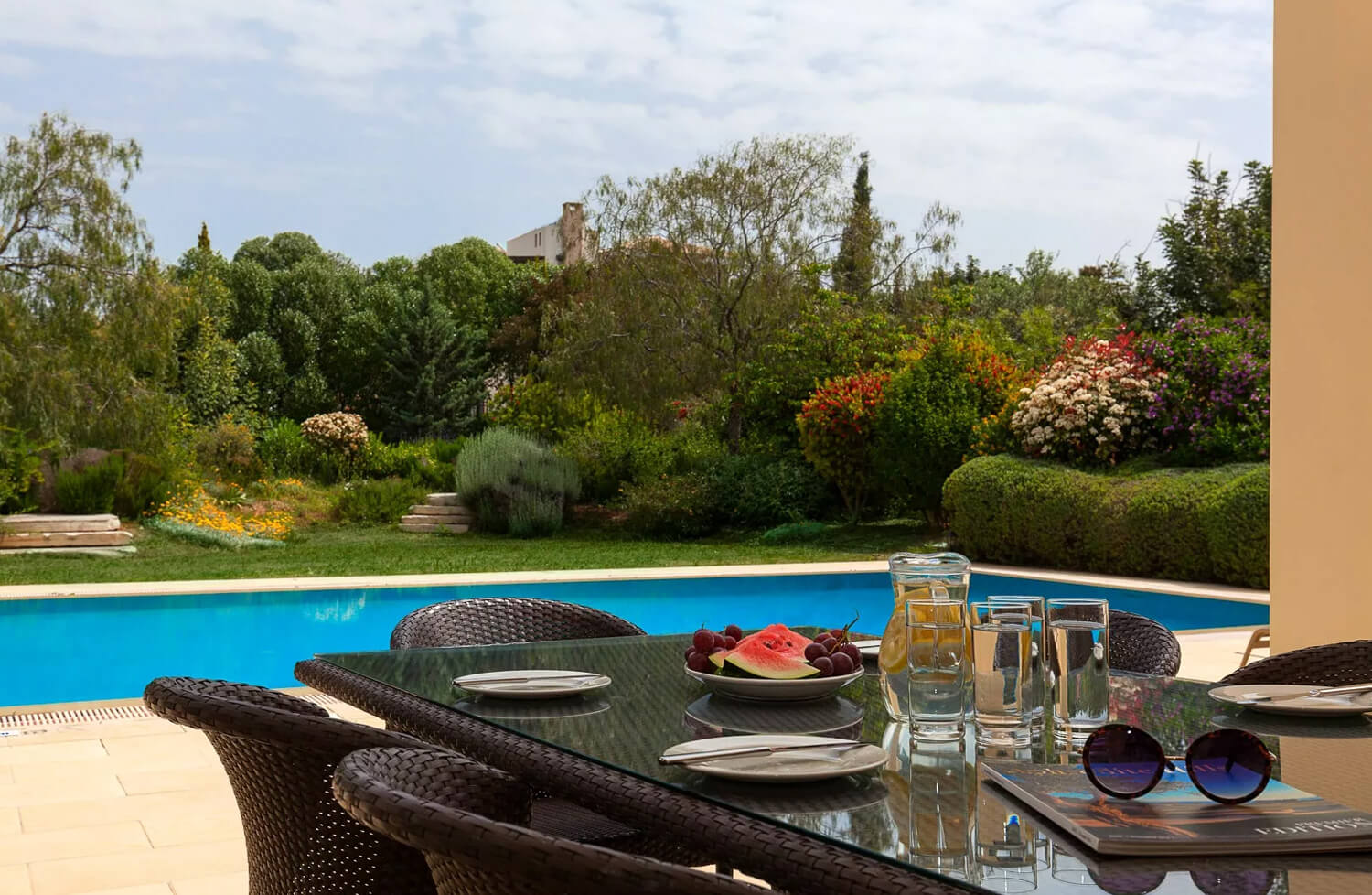 Дом окружен красивыми садом, и имеет частный бассейн размером 5 х 10 м с римскими ступенями. Кроме того, имеется отдельная площадка для барбекю с садовой обеденной мебелью, зона отдыха с шезлонгами и частная парковка.