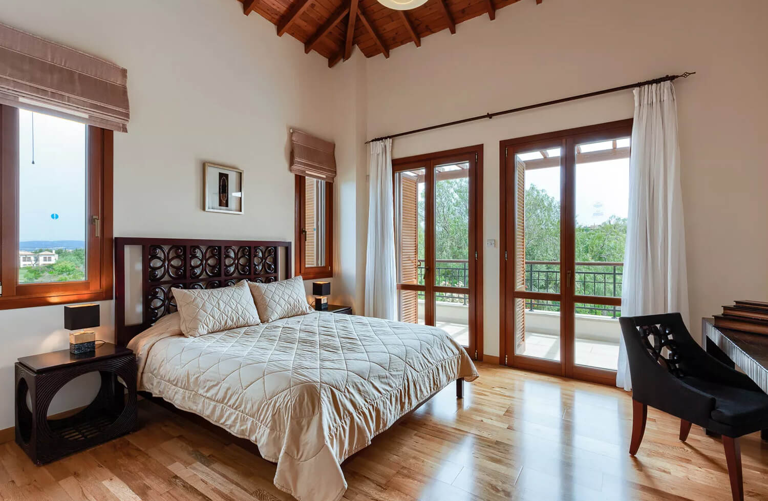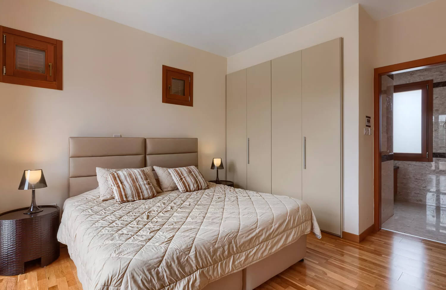 На втором этаже находится главная спальня с большой двуспальной кроватью, прикроватными тумбочками и встроенными шкафами, туалетным столиком и собственной ванной комнатой с гидромассажной ванной, встроенной душевой кабинкой и двойной раковиной.