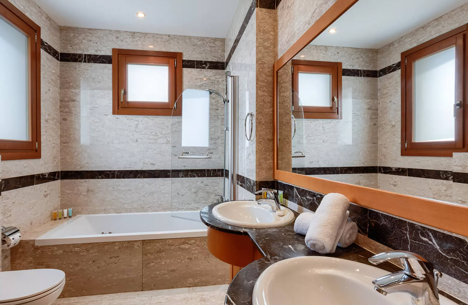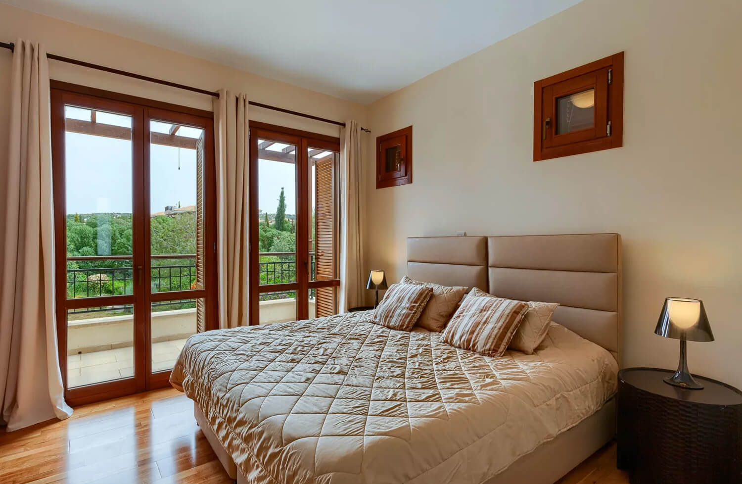 Во второй спальне есть две односпальные кровати, прикроватные тумбочки, достаточно места для туалетного столика и ванная комната с ванной / душем, туалетным столиком и туалетом. С балкона открывается прекрасный вид на курорт и горы.