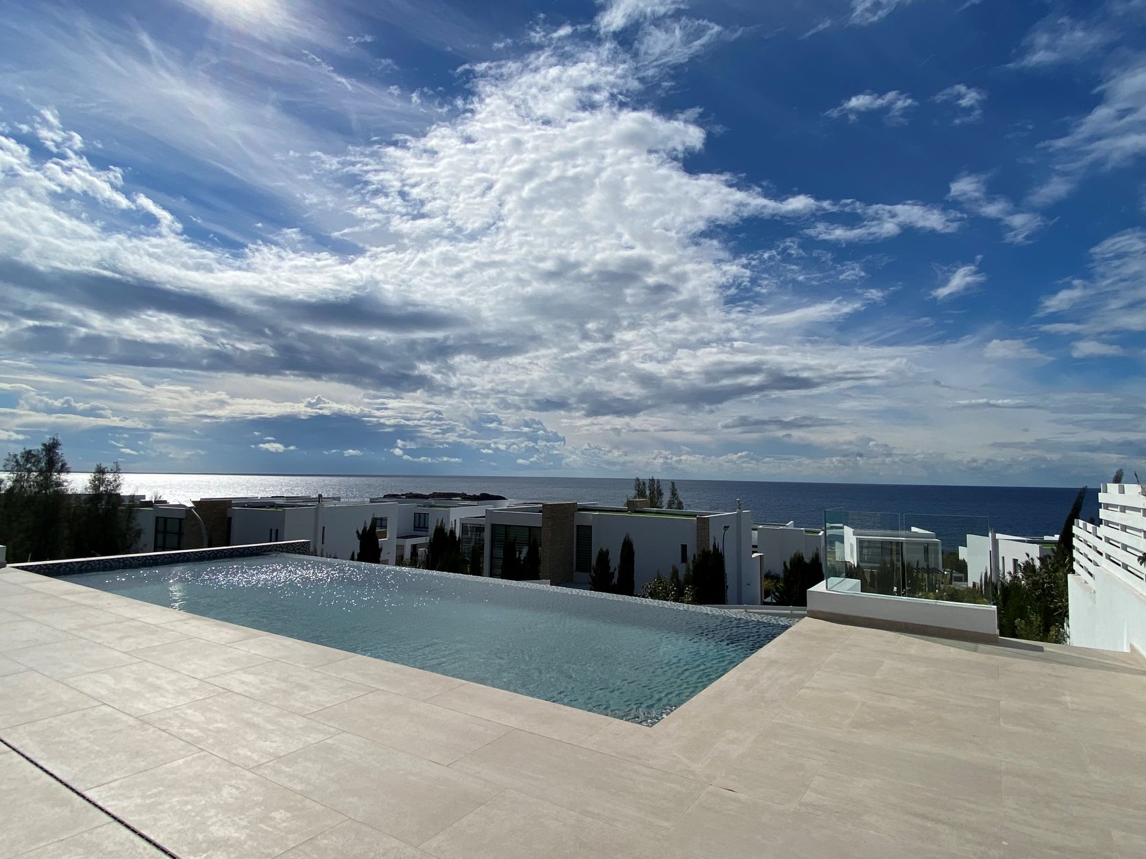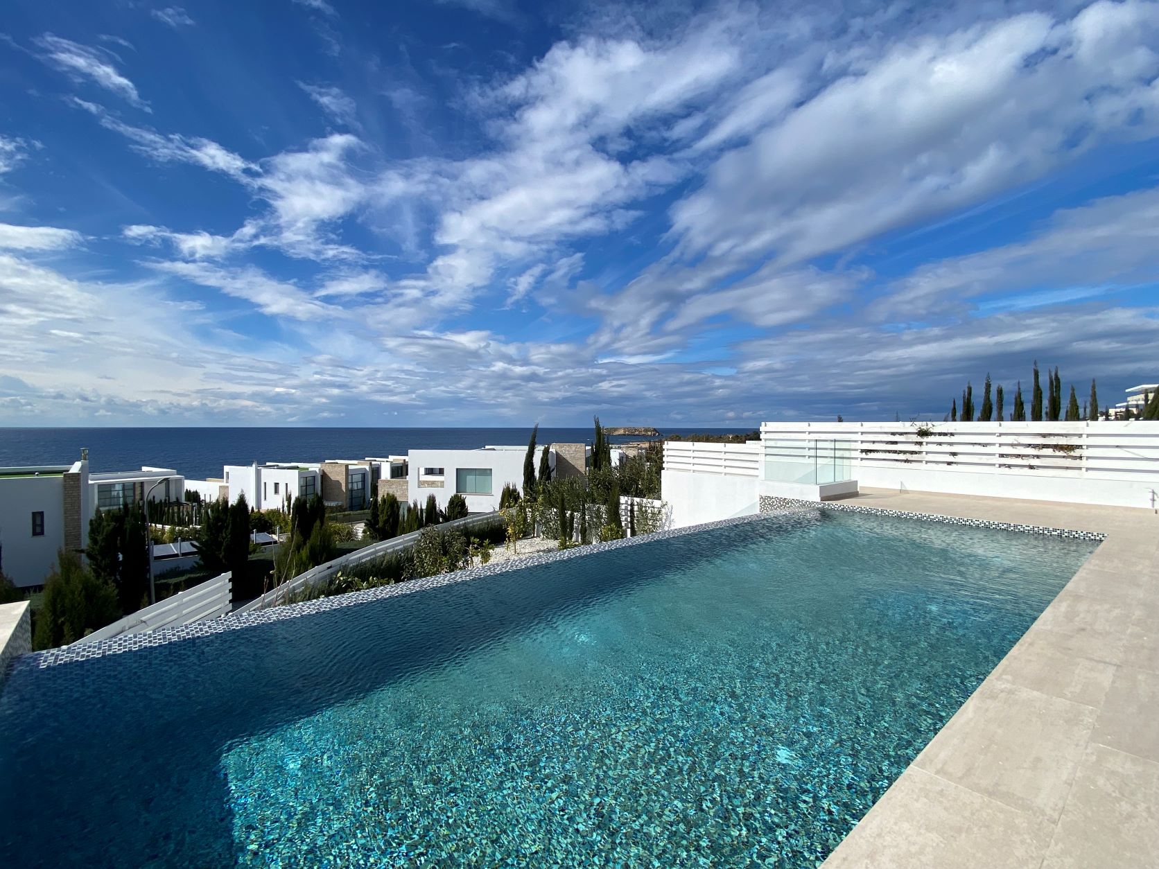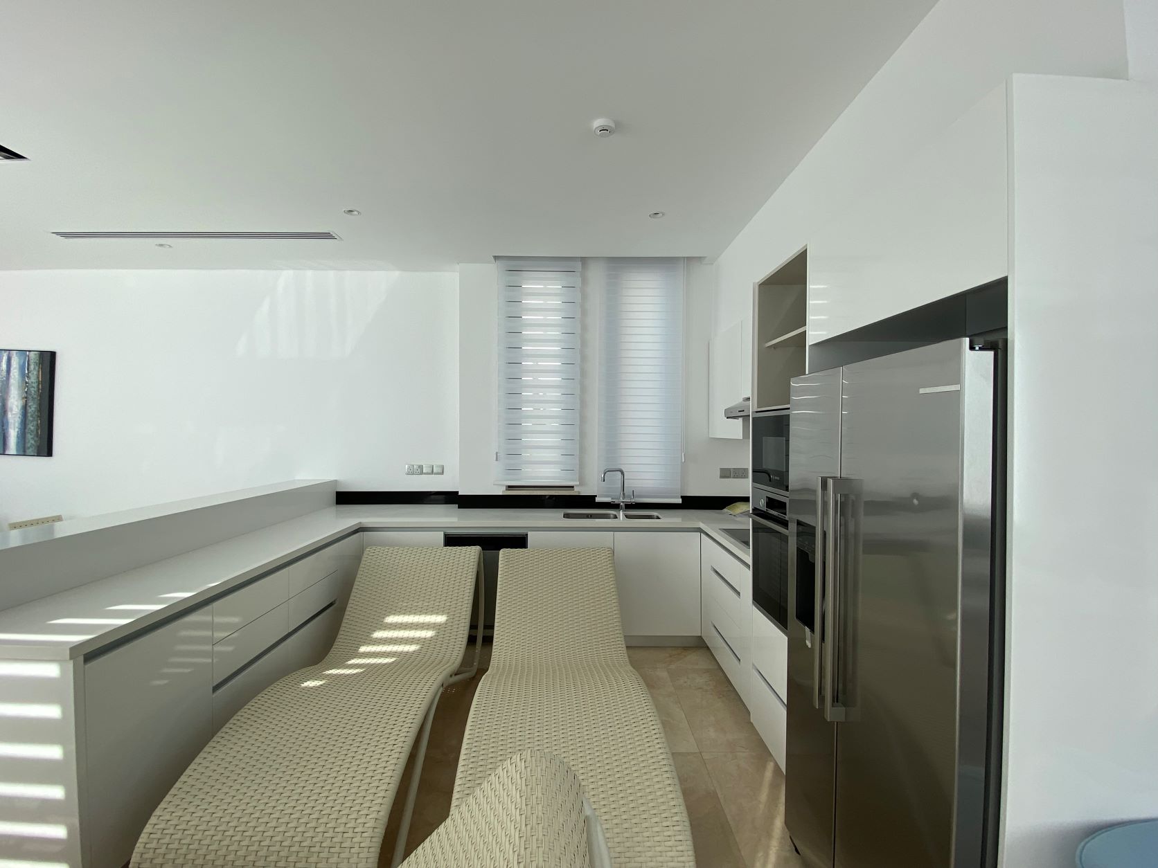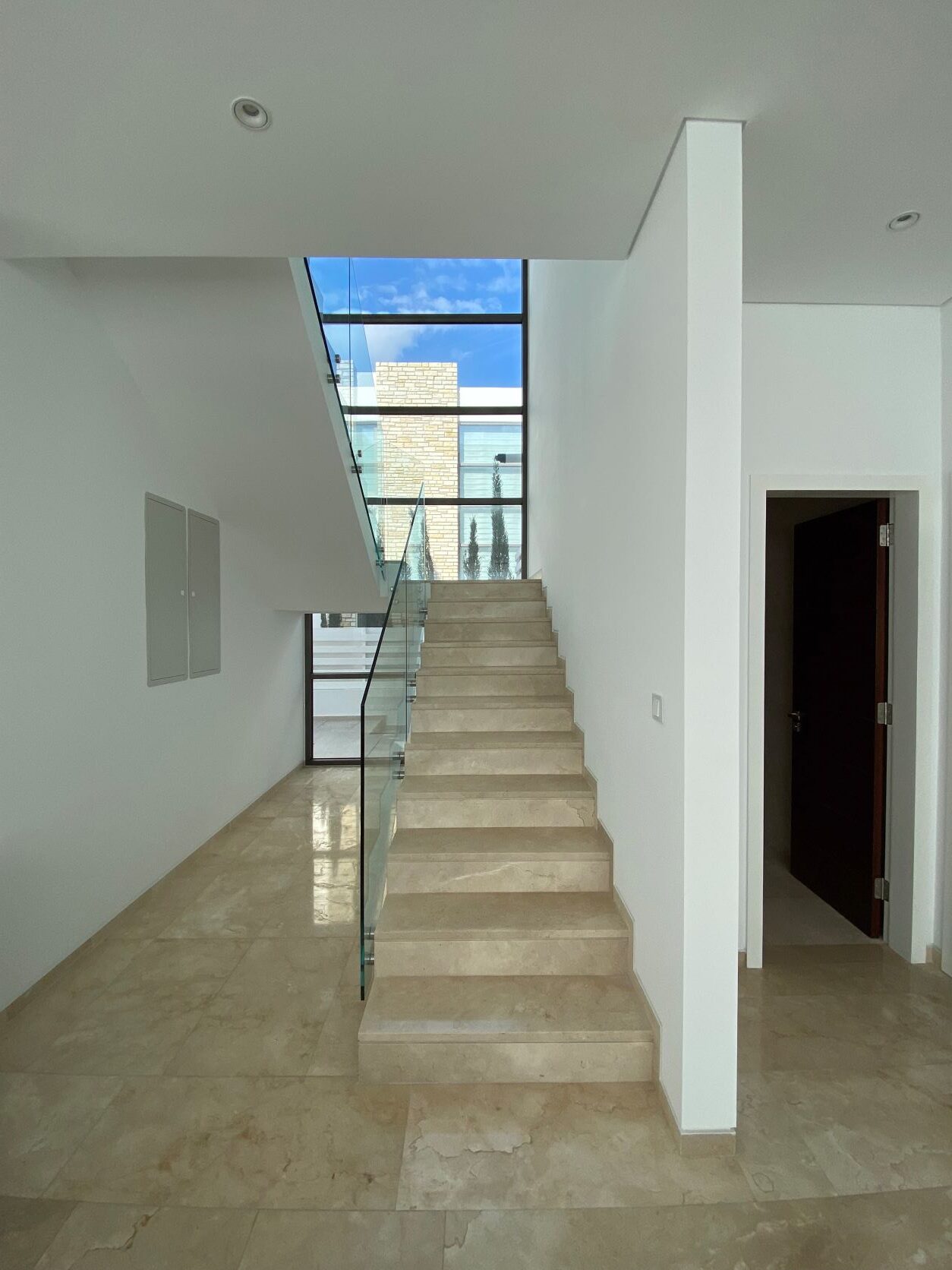 Данная вилла сочетает в себе современный стиль, высочайший уровень комфорта, систему Умный дом, элегантные дизайнерские решения и конечно же непередаваемые виды на море. На первом этаже дома расположена большая гостиная состоящая из двух зон, столовая с кухней открытого плана, прачечная, гостевой санузел, спальня. На втором этаже три большие с панорамными окнами спальни (главная с гардеробной и санузлом) и семейная ванная комната. Из гостиной патио двери ведут на большую террасу к бассейну с переливом и зоне барбекю, а также к саду с фруктовыми и цитрусовыми деревьями.