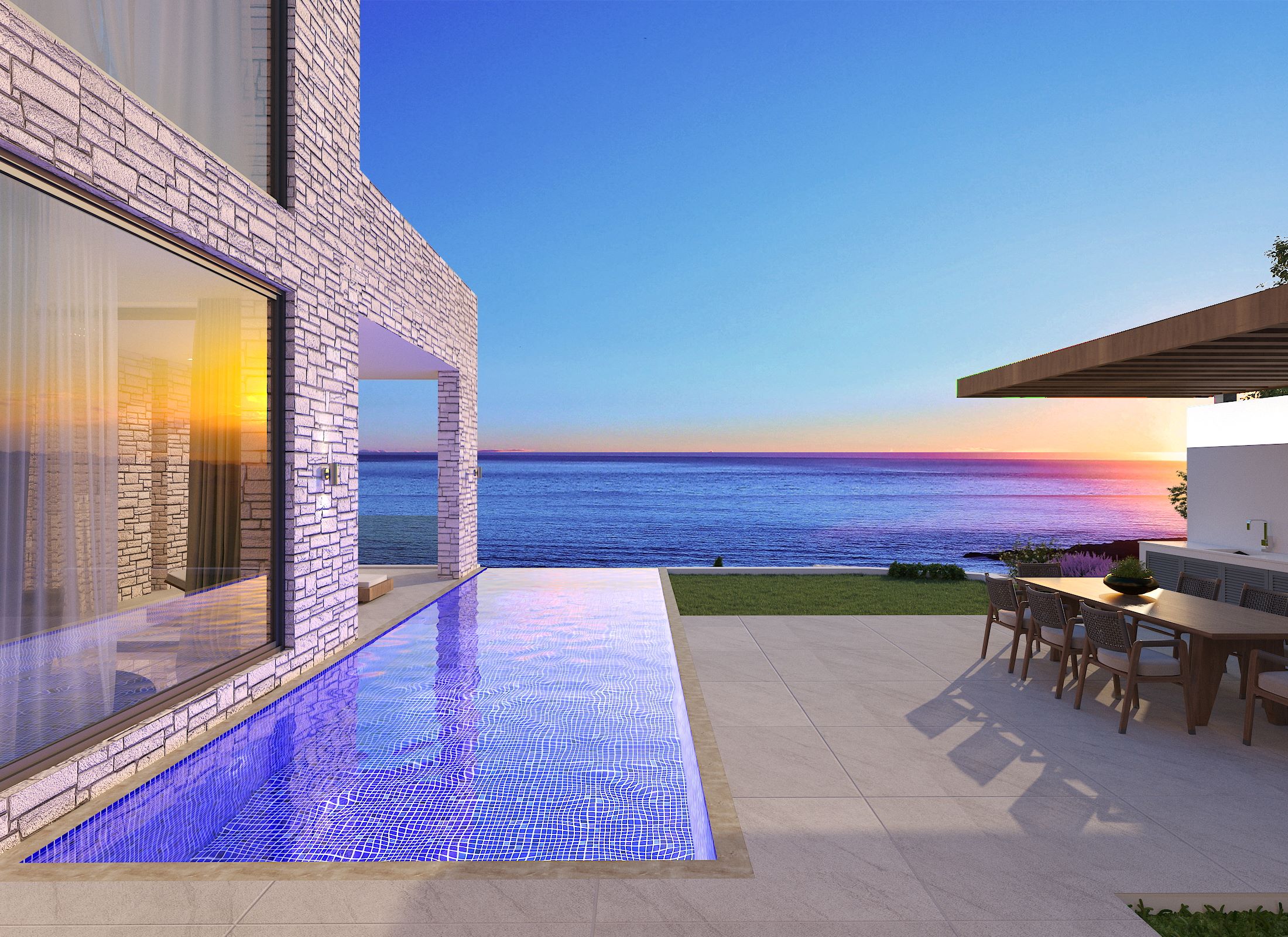 Комплекс расположен на берегу моря рядом с чистейшими кристально чистыми водами песчаного пляжа с бескомпромиссным видом на бесконечный горизонт.