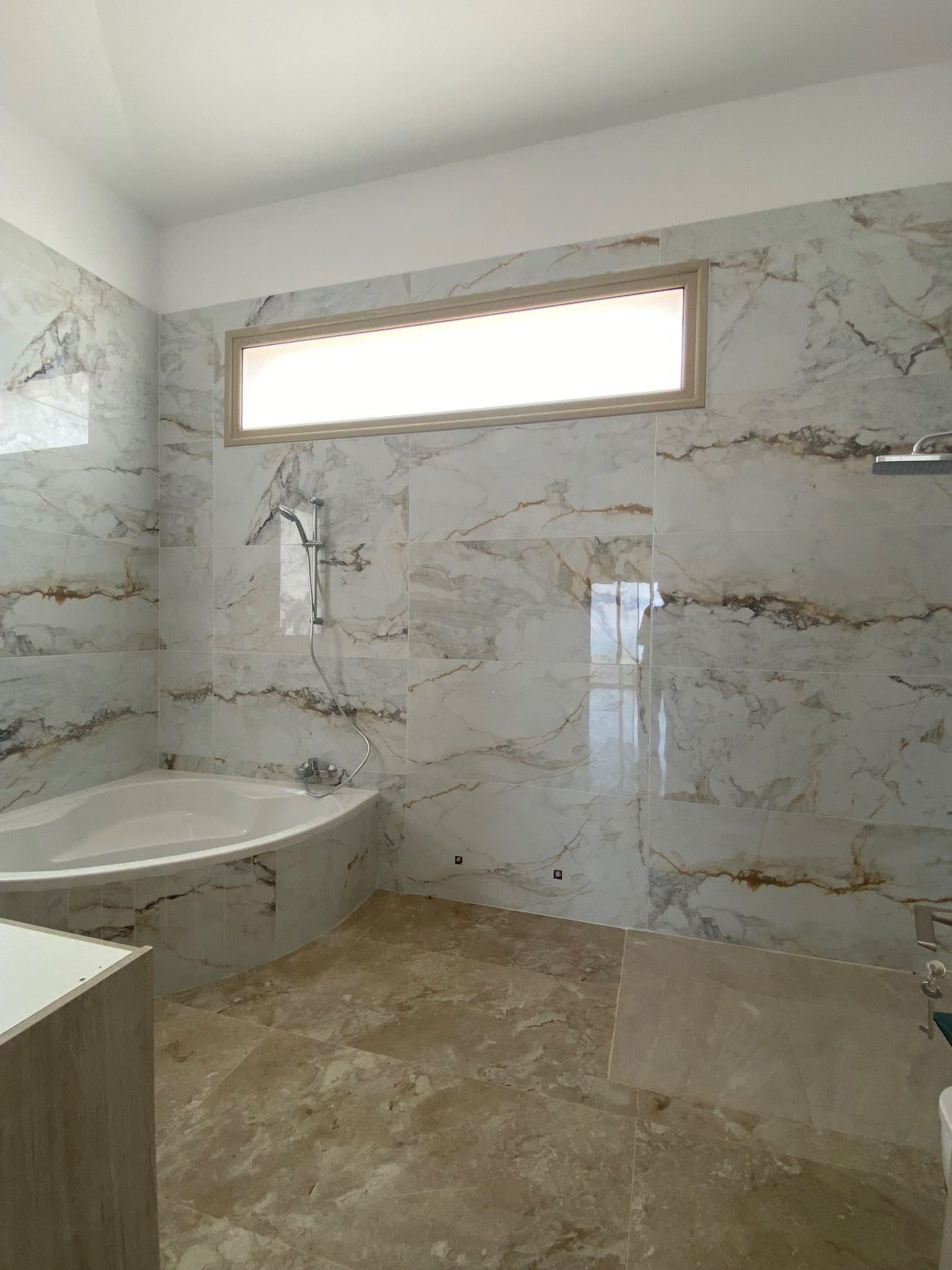 Вилла состоит из двух уровней, которые соединяются между собой широкой лестницей с гранитными ступенями. Вход в дом начинается с главного уровня, на котором находится большая гостиная, столовая с кухней открытого плана, санузел, большая крытая веранда с видом на море и горы, спальня с санузлом. На верхнем этаже три большого размера спальни с санузлами, вспомогательная кухня, семейная ванная комната, большие крытые балконы с великолепными видами. Большой ровный огороженный участок с автоматическими воротами, большим бассейном с переливом, подъездной дорожкой и ландшафтным дизайном.