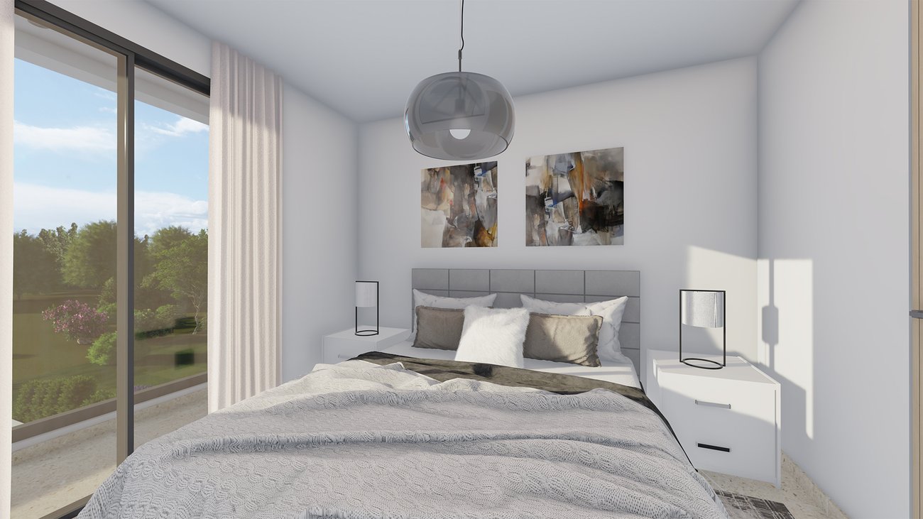 При входе на виллу через крытый вход просторные жилые помещения на первом этаже включают в себя полностью оборудованную кухню с обеденной зоной и современную гостиную, а также на этом уровне находится гостевой туалет. На верхнем этаже расположены три спальни и две просторные ванные комнаты. Жители этой виллы имеют преимущество использования общего бассейна.
