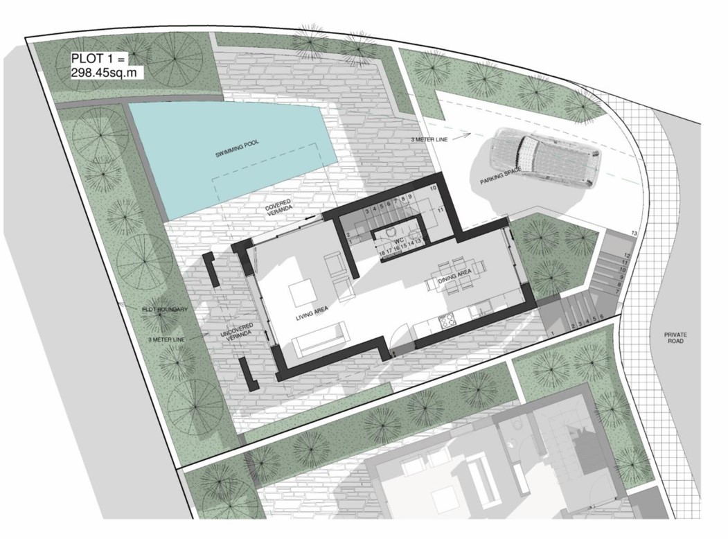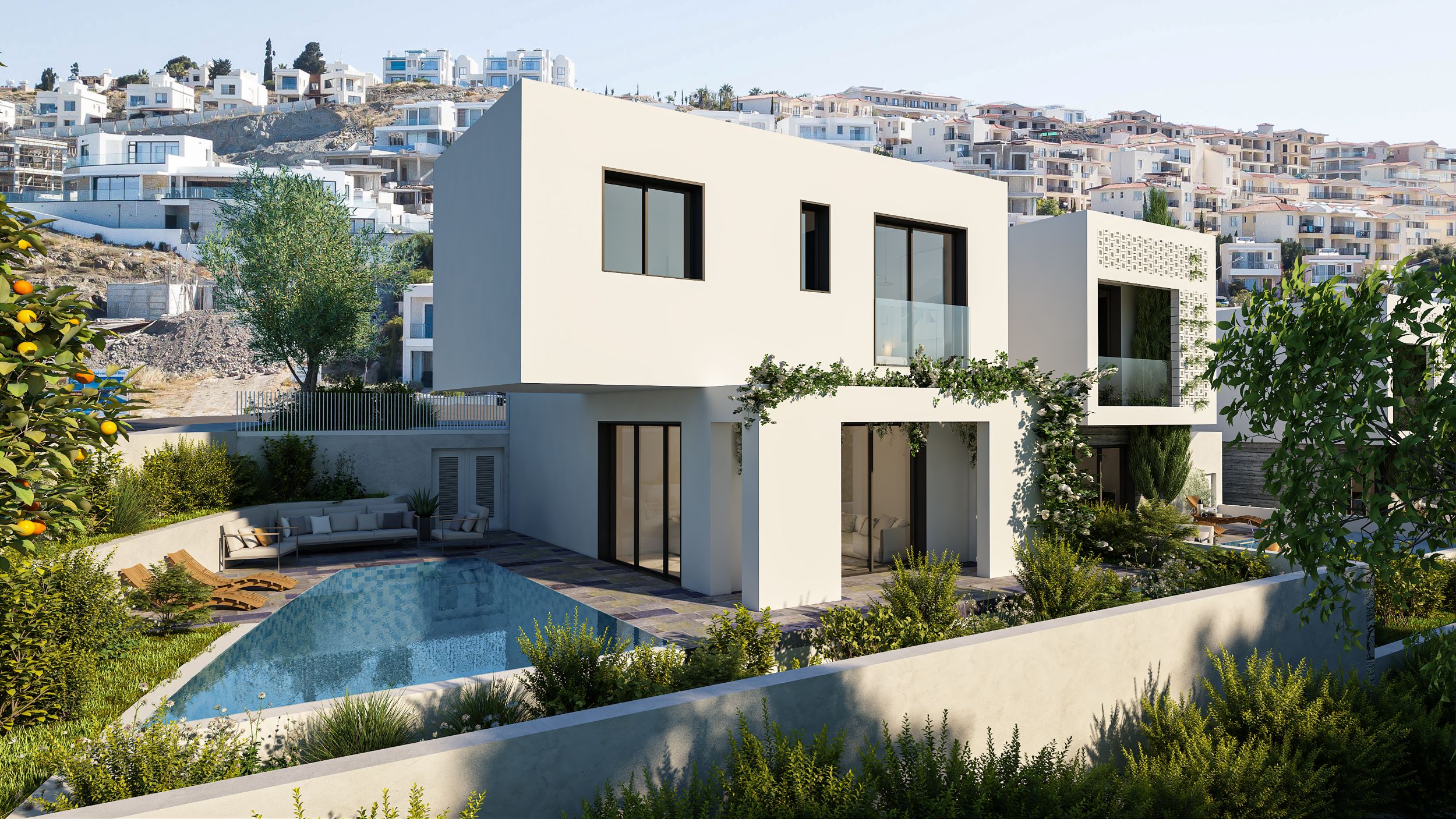 Уникальный проект, характеризующийся привлекательной современной архитектурой с просторными и удобными зонами в окружении зелени. Гениальное сочетание отделки белого цвета и арт-бетона для декора стен. Живописные виды на море. В пешей доступности к пляжу и удобствам.