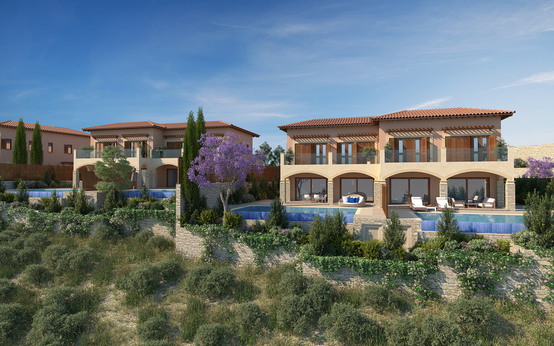Виллы оснащены скрытой системой кондиционирования, имеют частные бассейны и сады.