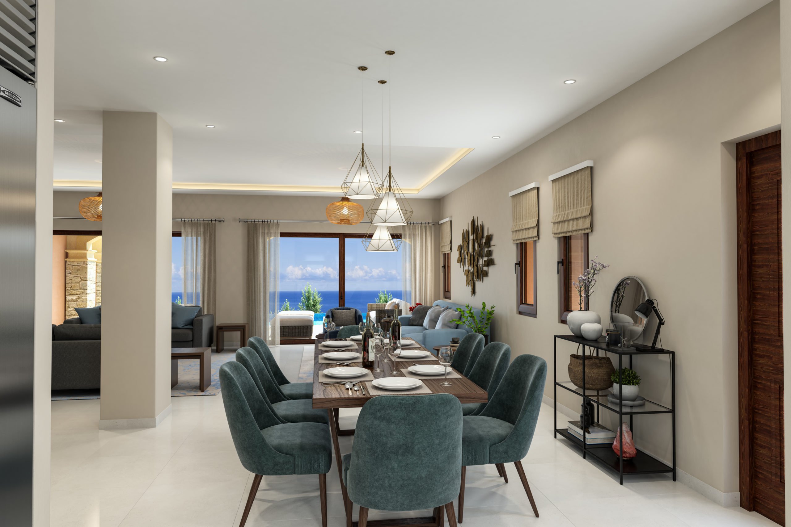 Выход на крытую террасу, в сад и к частному бассейну лежит через большие остекленные двери.