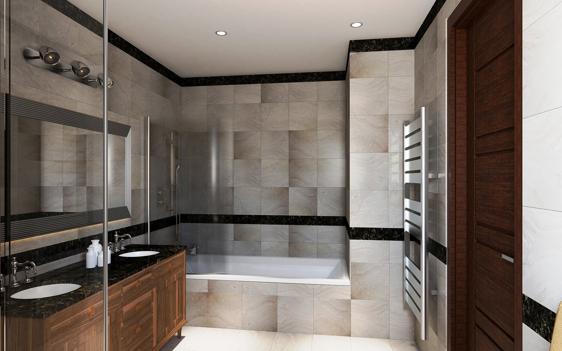 Большая ванная комната оборудована гидромассажной ванной, душевой кабиной с ливневым душем и гидромассажными панелями, а также двумя раковинами.