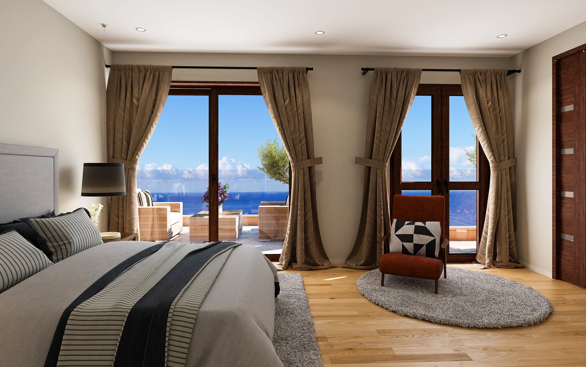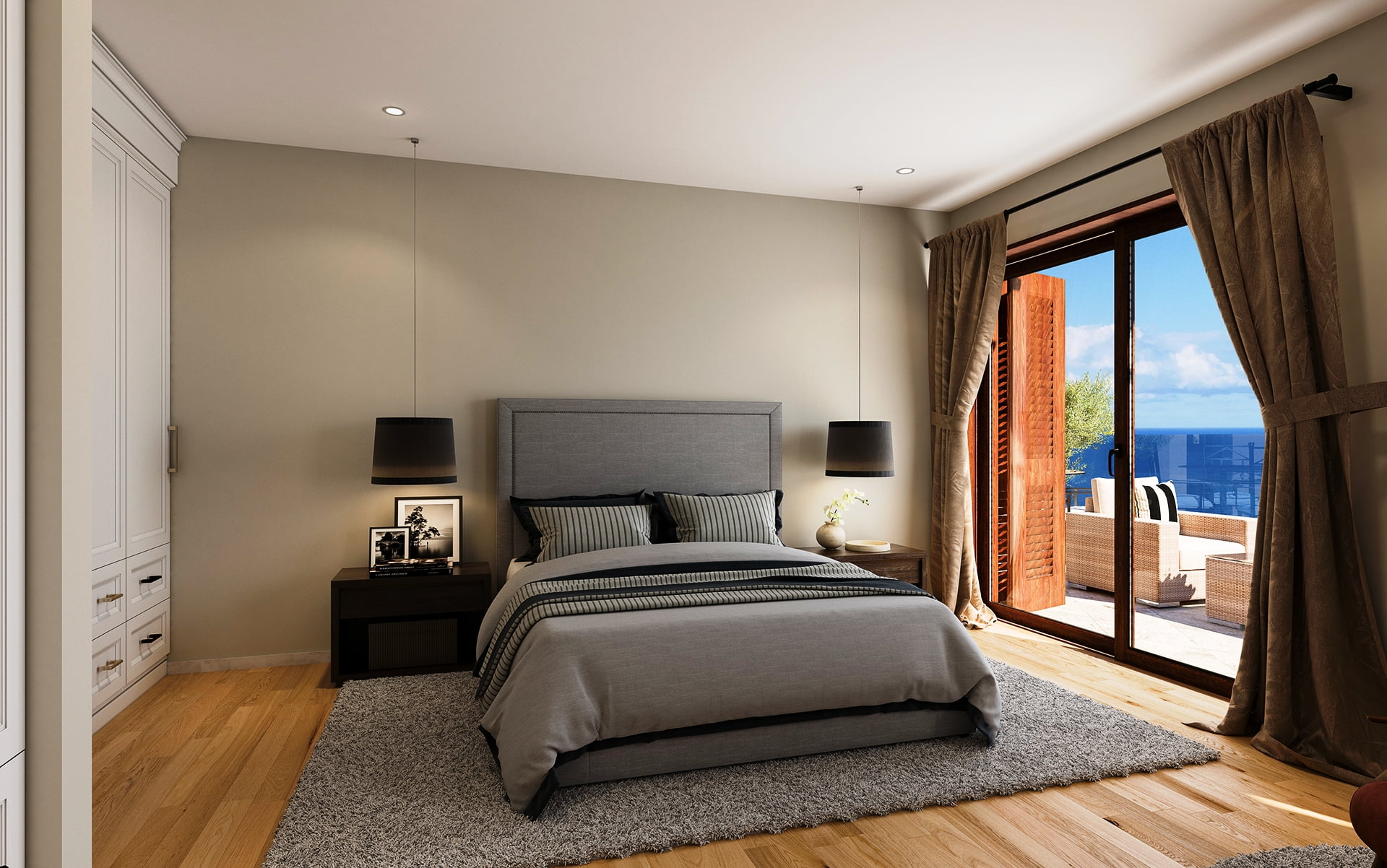 Две дополнительные спальни с просторными смежными ванными завершают планировку второго этажа. Одна из спален имеет выход на террасу с видом на море