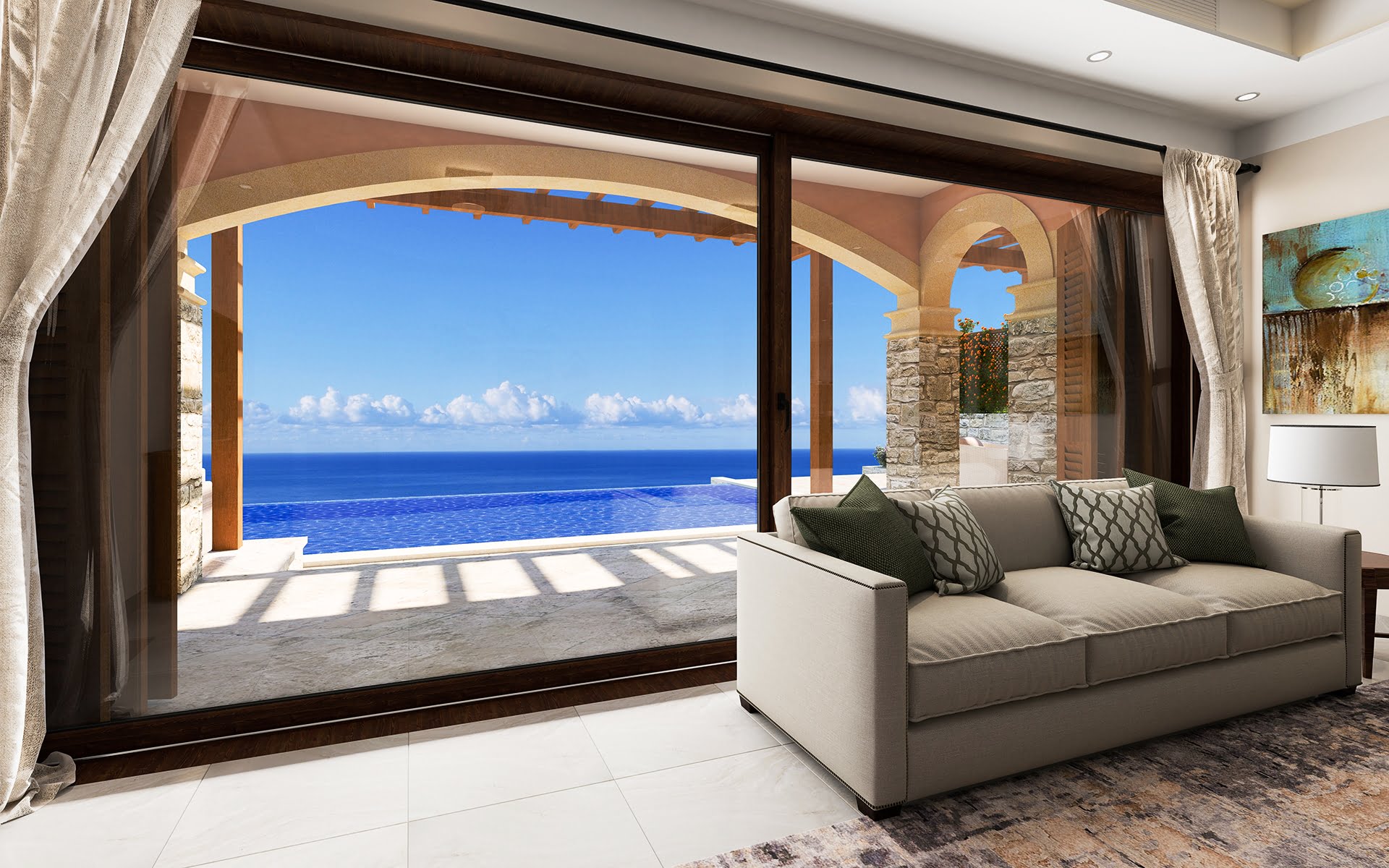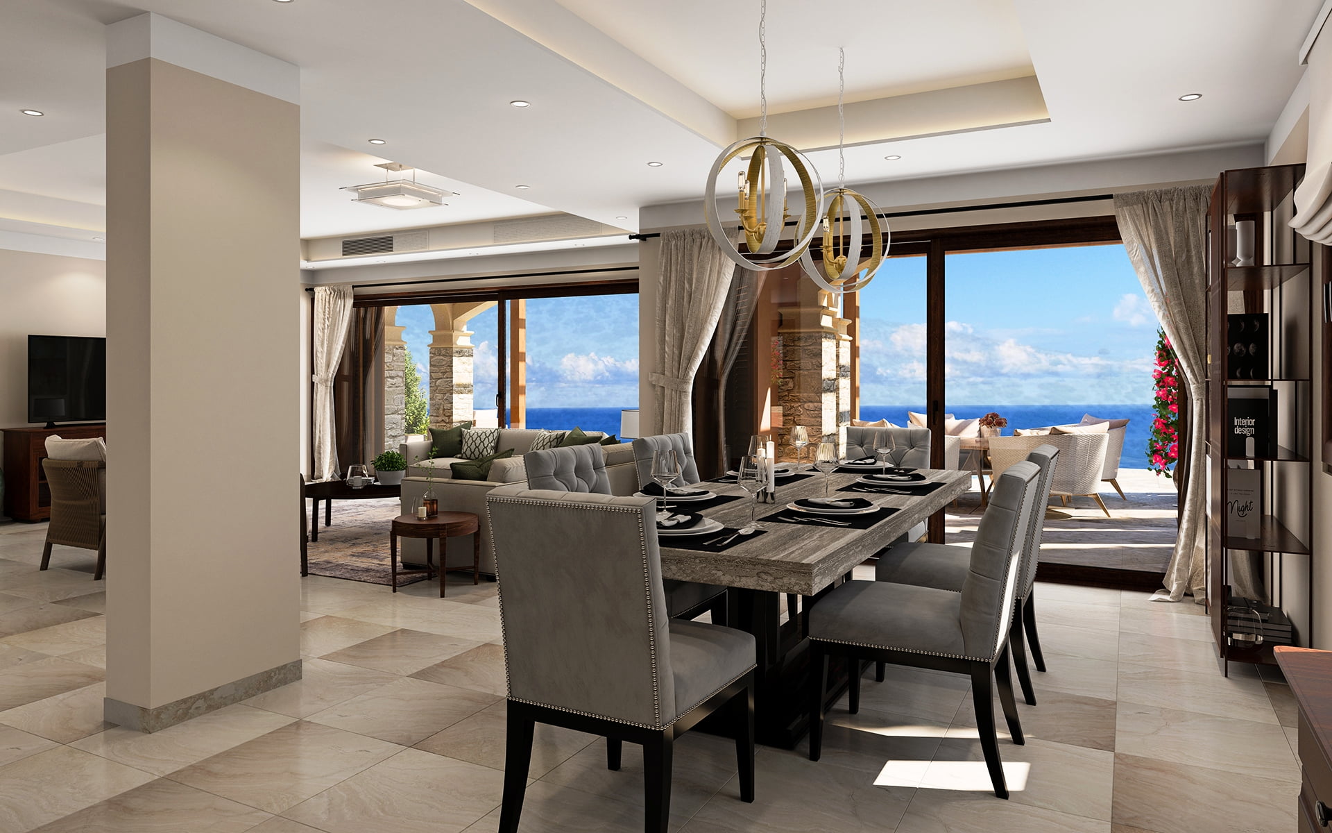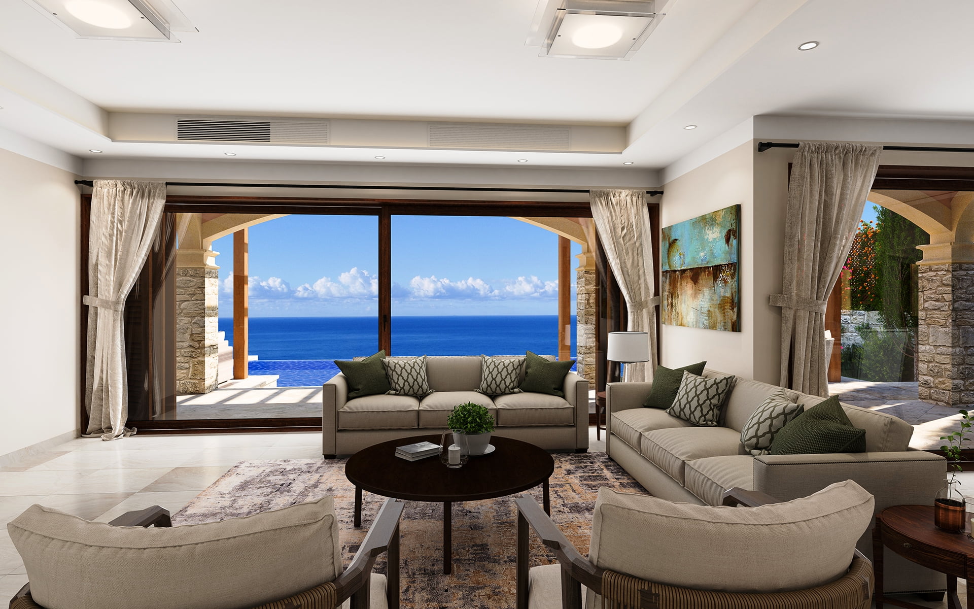 Далее следует гостиная с панорамными окнами и выход на веранду, откуда открывается захватывающий вид на море и ландшафтные сады.