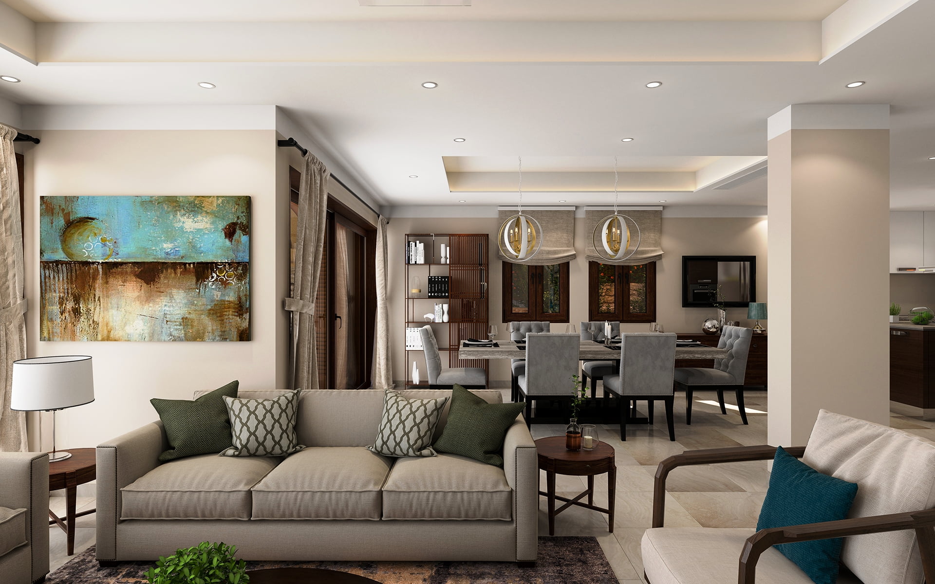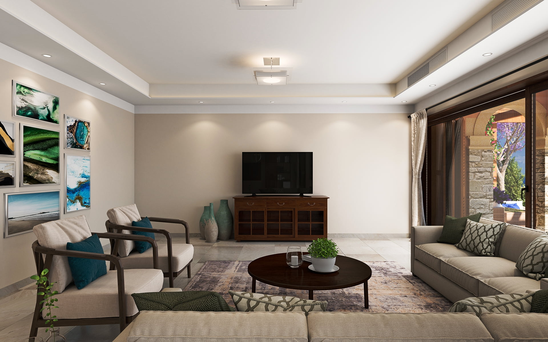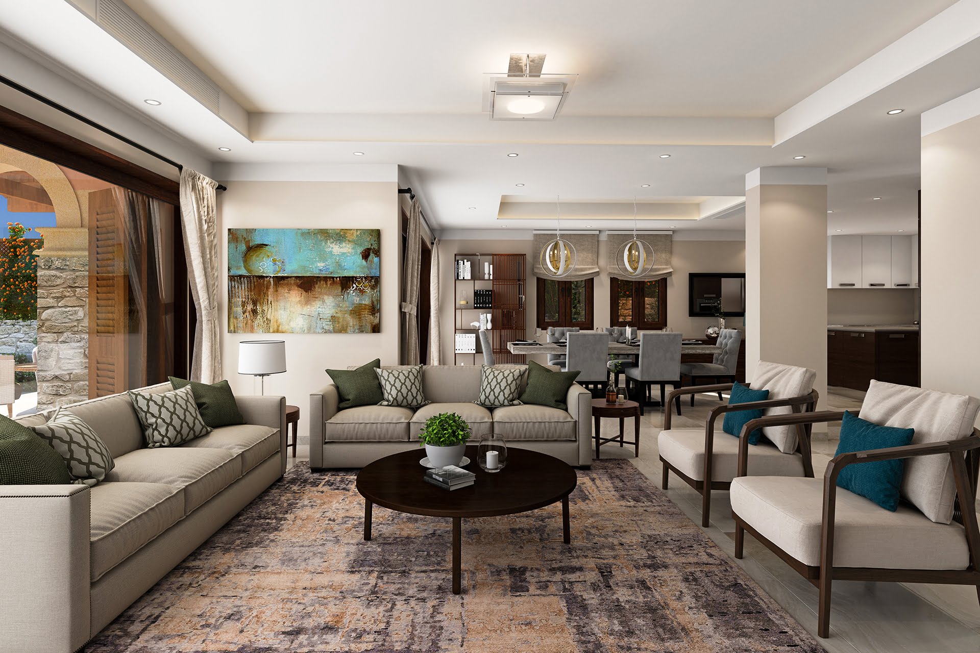 Далее следует гостиная с панорамными окнами и выход на веранду, откуда открывается захватывающий вид на море и ландшафтные сады.