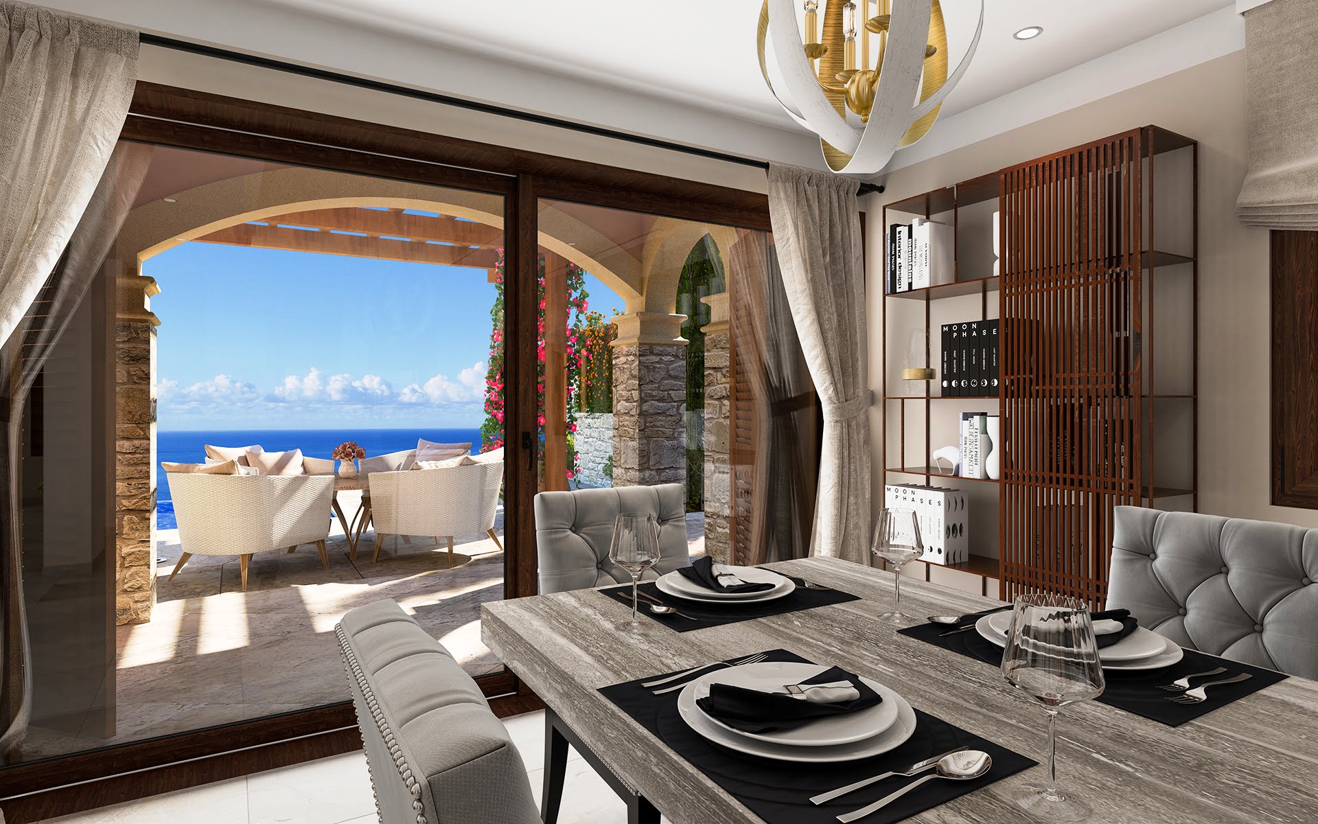 Большая столовая также имеет выход на отдельную крытую веранду. Кухня открытой планировки полностью оборудована современной техникой. С веранды спальной комнаты открывается великолепный вид на море.