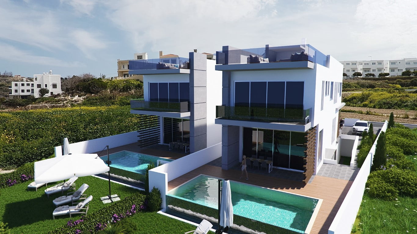 Две эксклюзивные трёхуровневые виллы с высочайшими стандартами строительства и отделки на первой линии от моря. Непосредственно перед участками домов есть только полоса обособленного песчаного/галечного пляжа. В шаговой доступности находятся магазины, рестораны, круглосуточные минимаркеты. Виллы располагают большими террасами на крыше (150м2), пятью спальнями, семью санузлами.