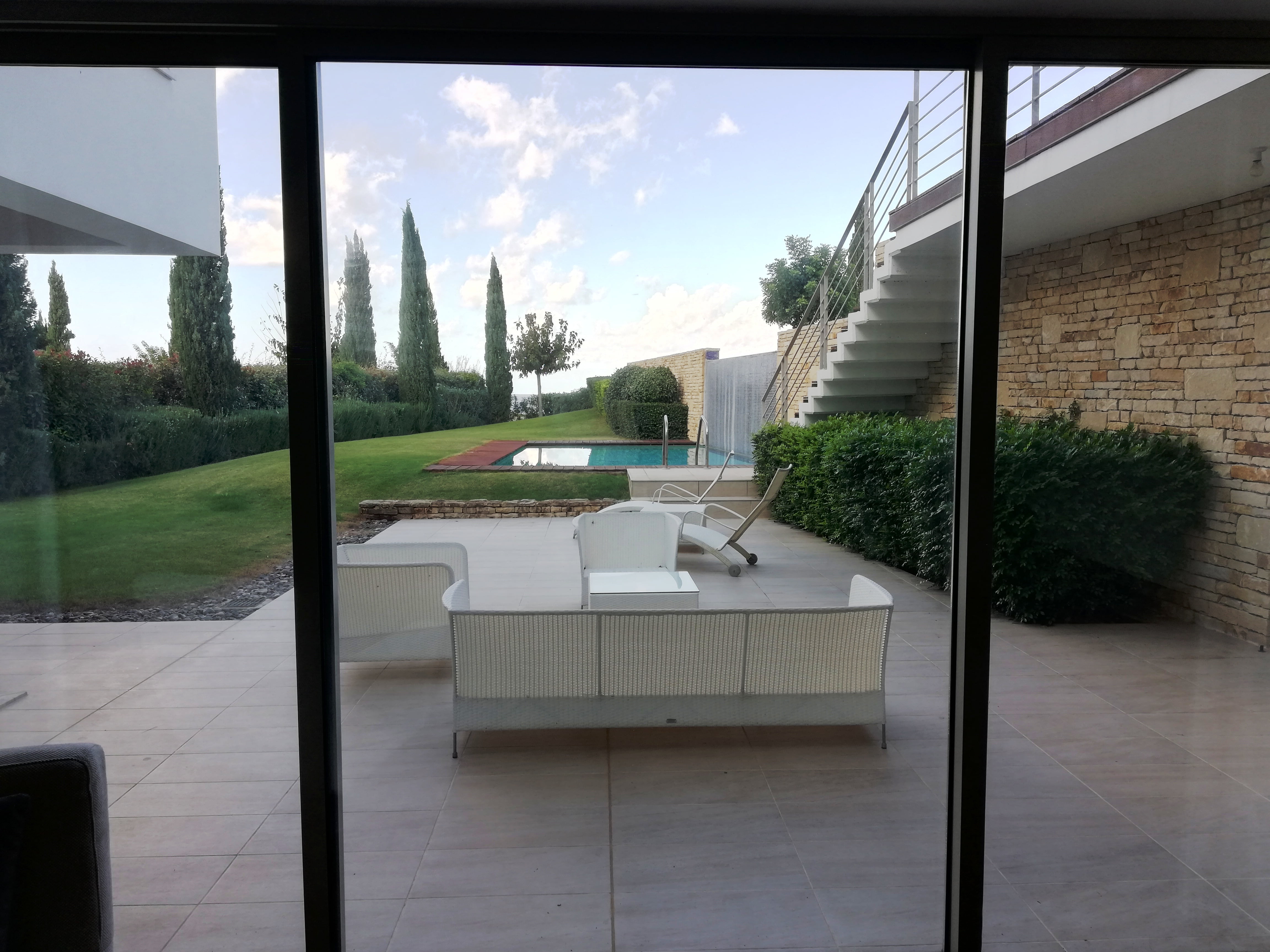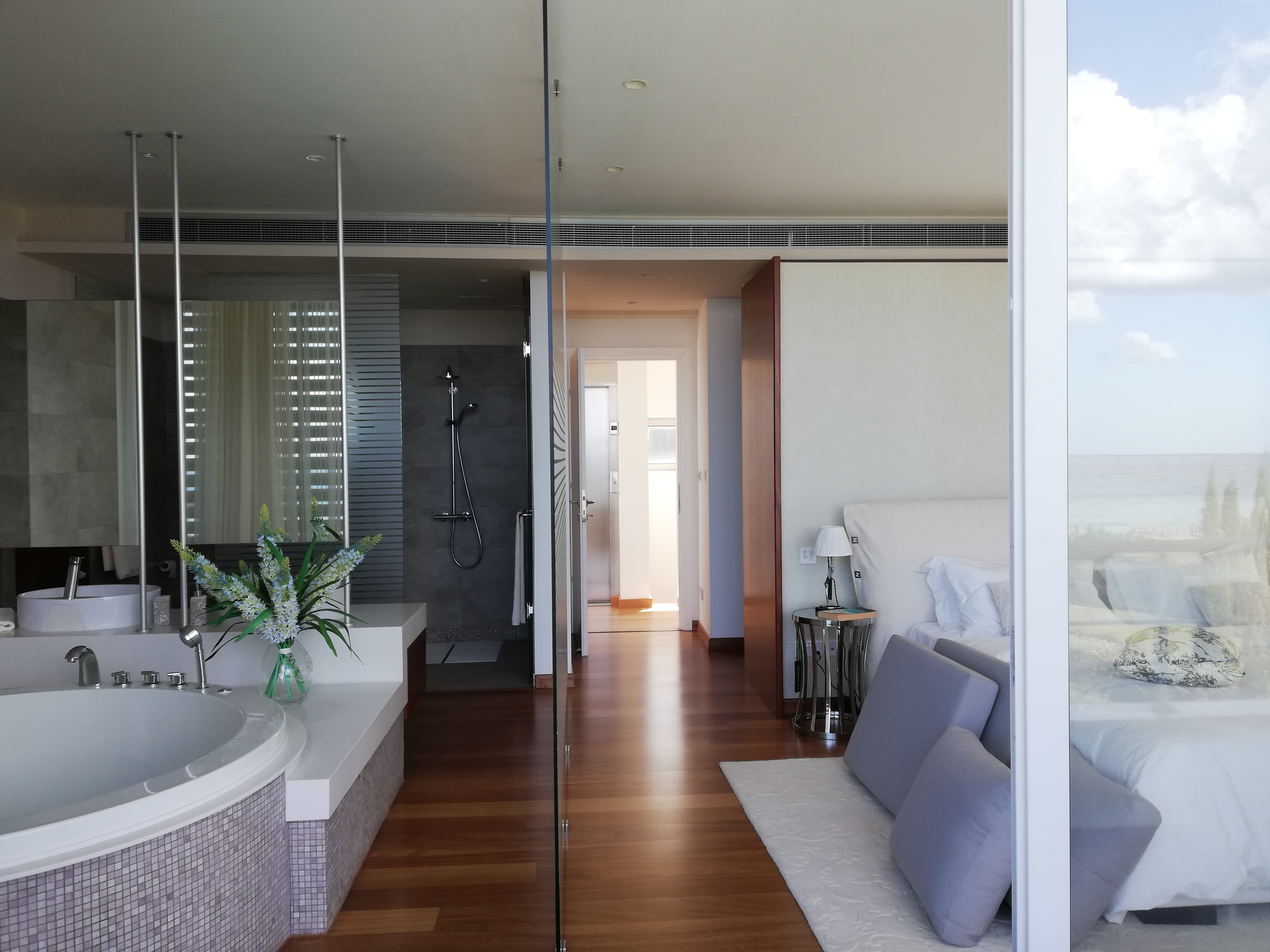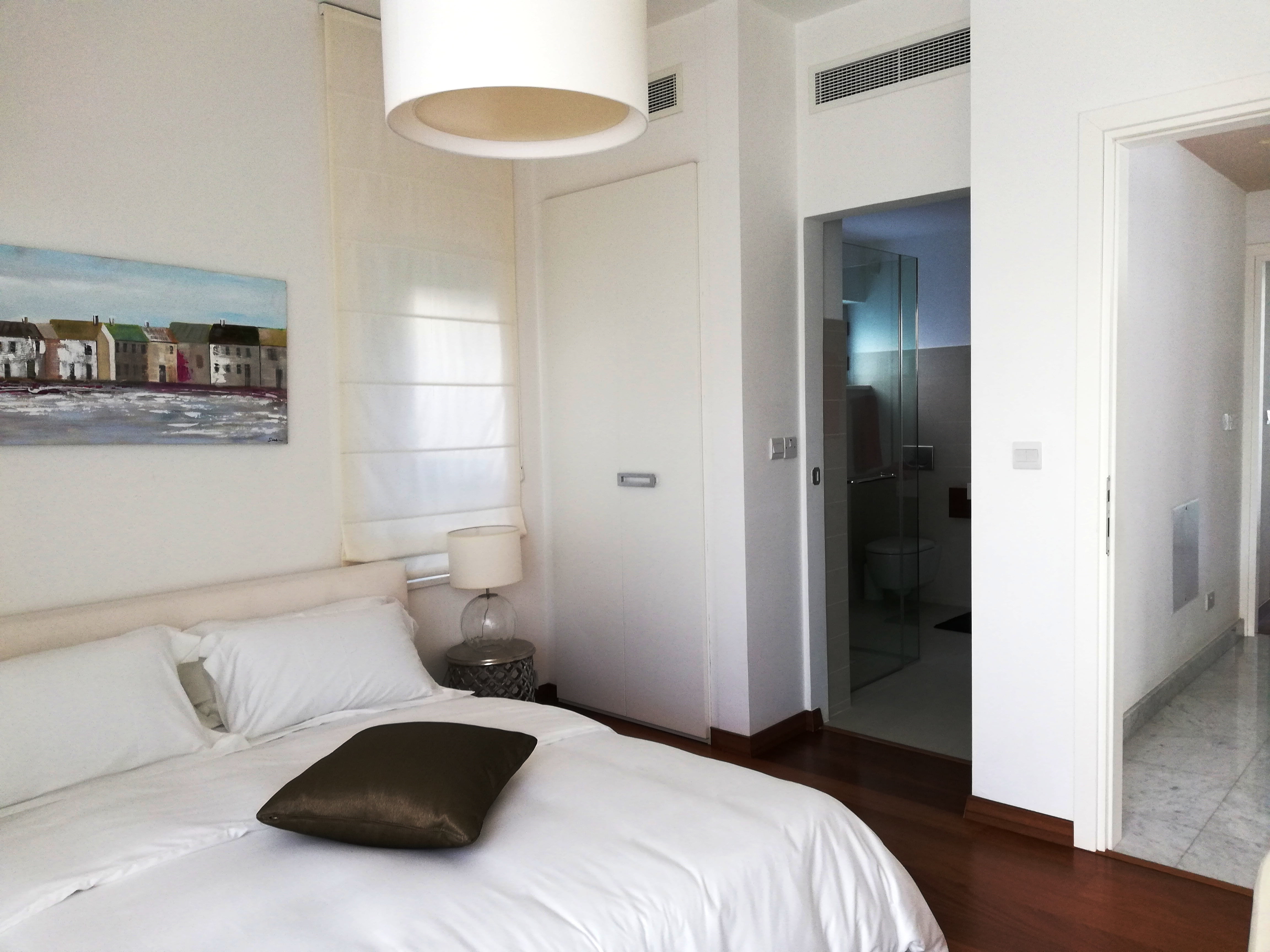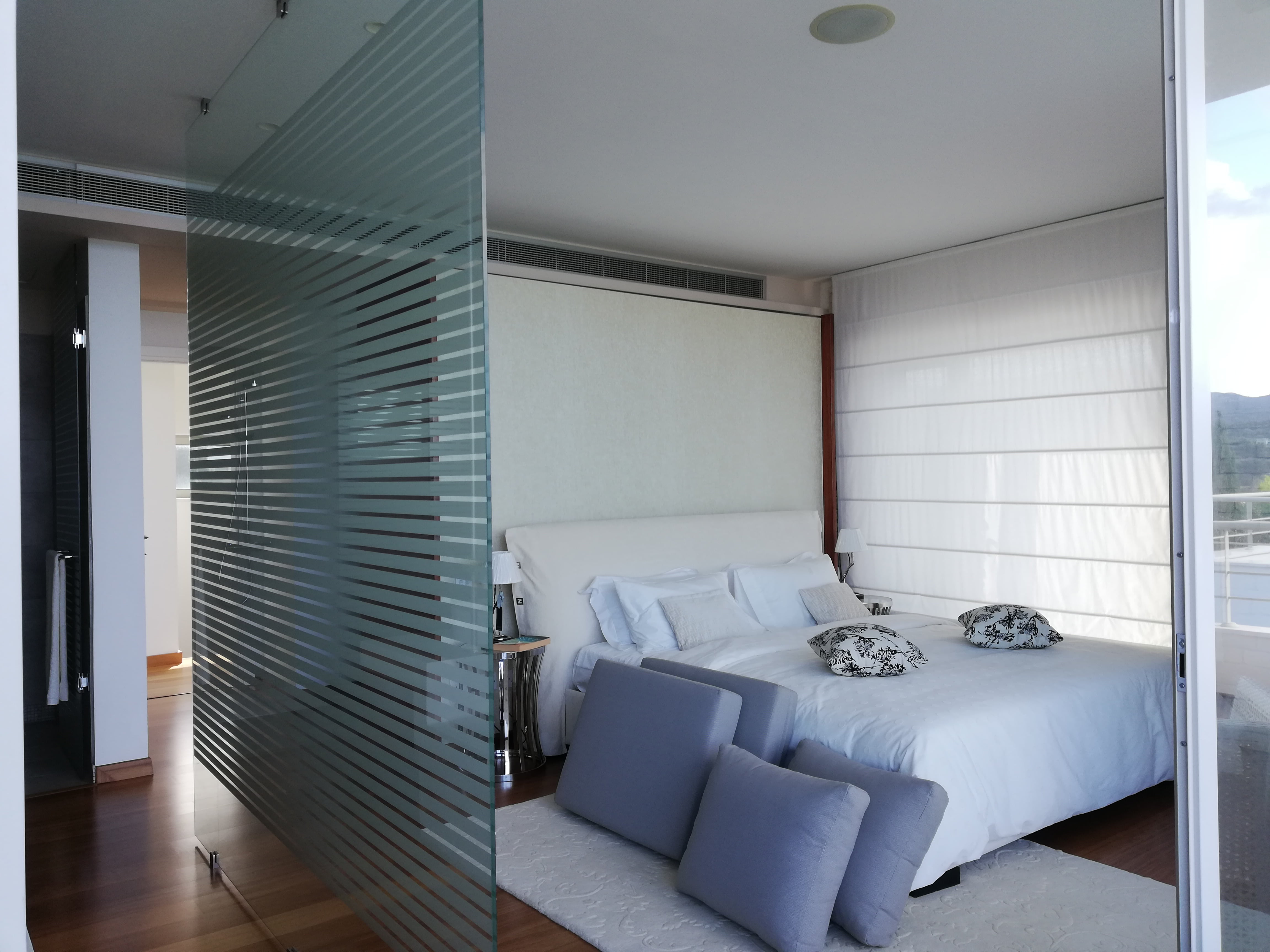 Самый верхний этаж занимает главная спальня с гардеробной, ванной комнатой, а также большая терраса с джакузи. С террас верхнего и среднего уровней открывается великолепный панорамный вид на море.