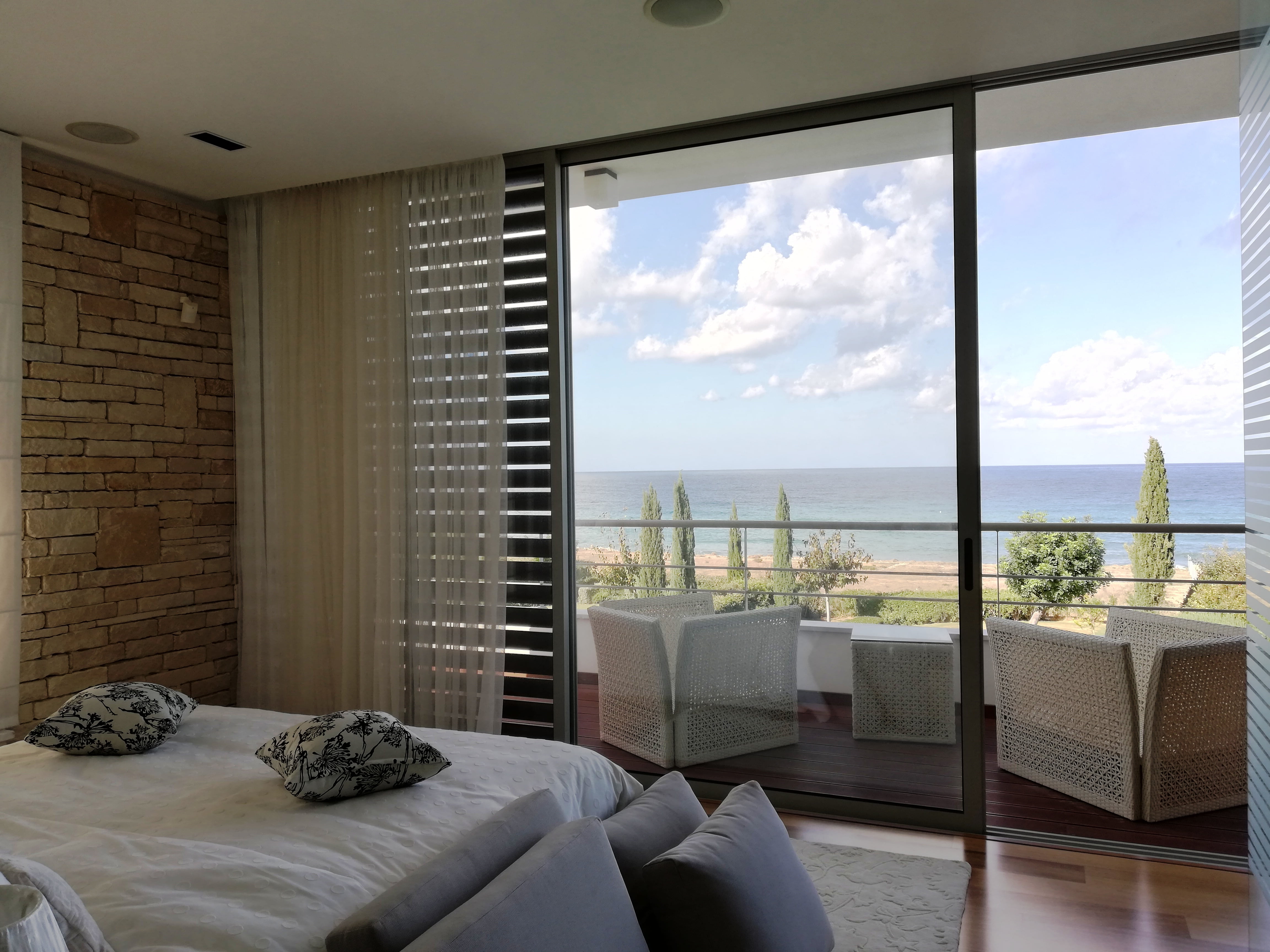 Предлагаемая эксклюзивная вилла расположена на первой линии, с потрясающим видом на море, залив Хрисоху и мыс заповедника Акамас. При въезде на территорию виллы вы сразу оказываетесь в атмосфере абсолютной приватности и комфорта. Дом состоит из трёх уровней, соединяющихся между собой лифтом и лестницей. Главный вход расположен на среднем уровне, где также находится большая гостиная с камином, кухня, столовая, гостевой санузел, 2 спальни с отдельными ванными комнатами. Панорамные балконные двери ведут на просторную веранду с выходом к саду и верхнему уровню бассейна
