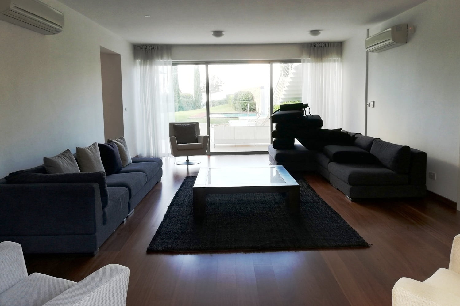 . Этажом ниже расположились просторная гостиная с видом на нижний уровень бассейна и сад, конференц-зал, две спальни с ванными комнатами, вспомогательная кухня, прачечная, серверная, кладовая.