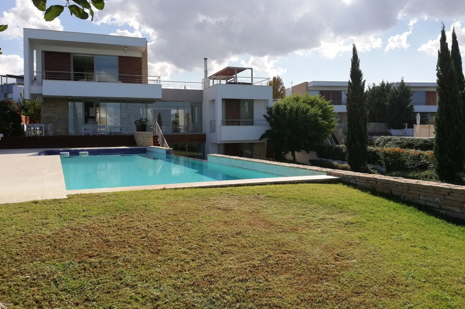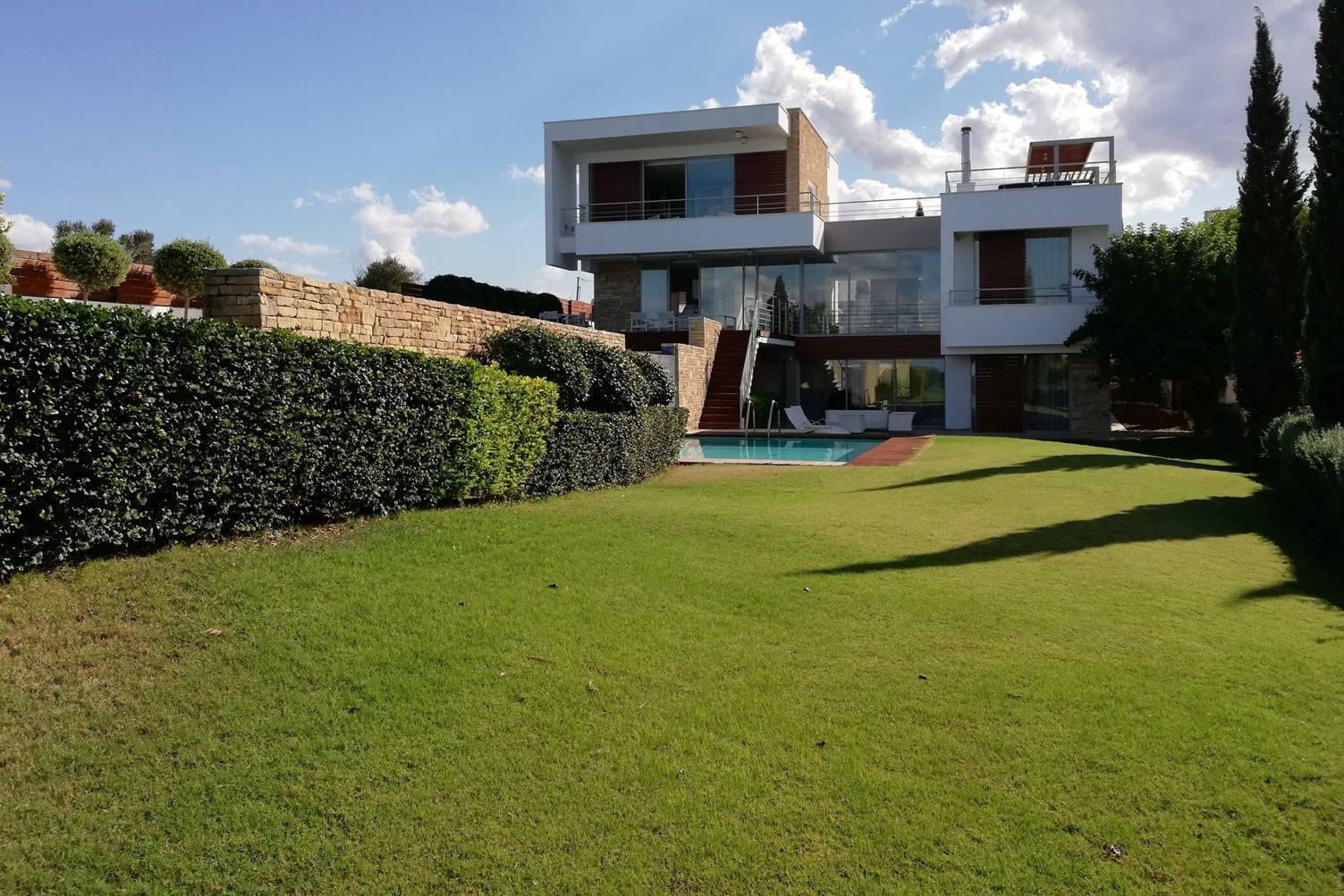 На участке разбит прекрасный сад, высажен газон, есть двухуровневый бассейн с подогревом.