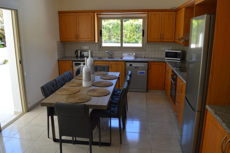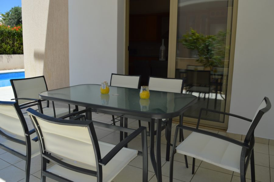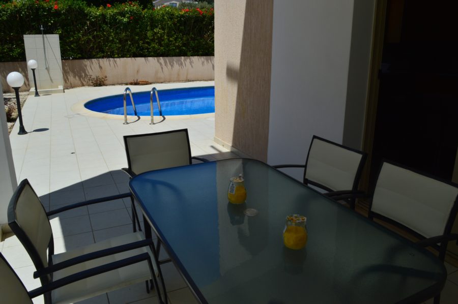 Вилла расположена в нижней части пригорода Пафоса — Хлорака, в закрытом небольшом комплексе с красивой садовой территорией. Неподалеку находятся таверны, супермаркет, круглосуточный минимаркет, автобусные остановки, кафе, отели с аквапарками. Прогулка к морю займет не более 10 минут.